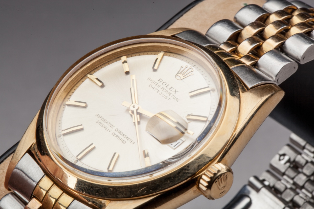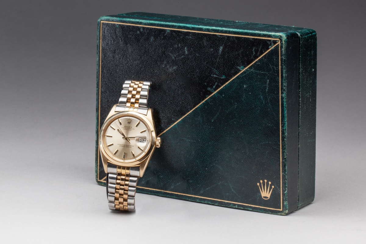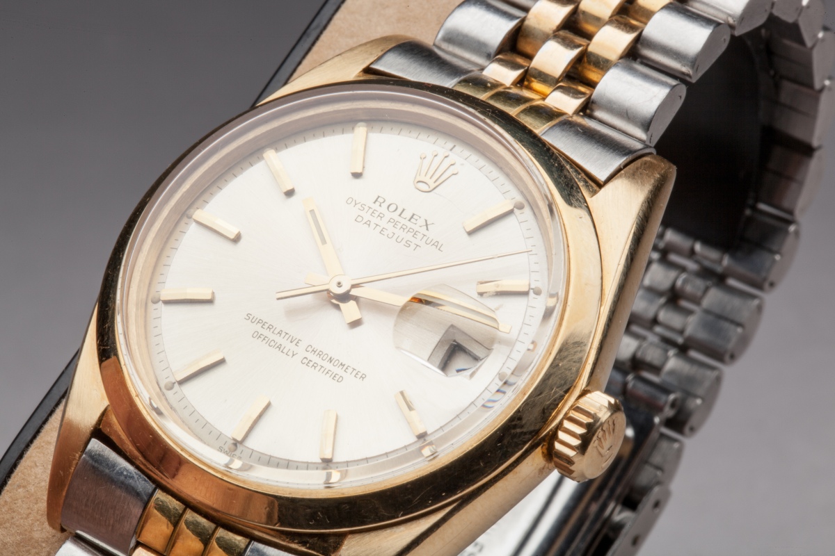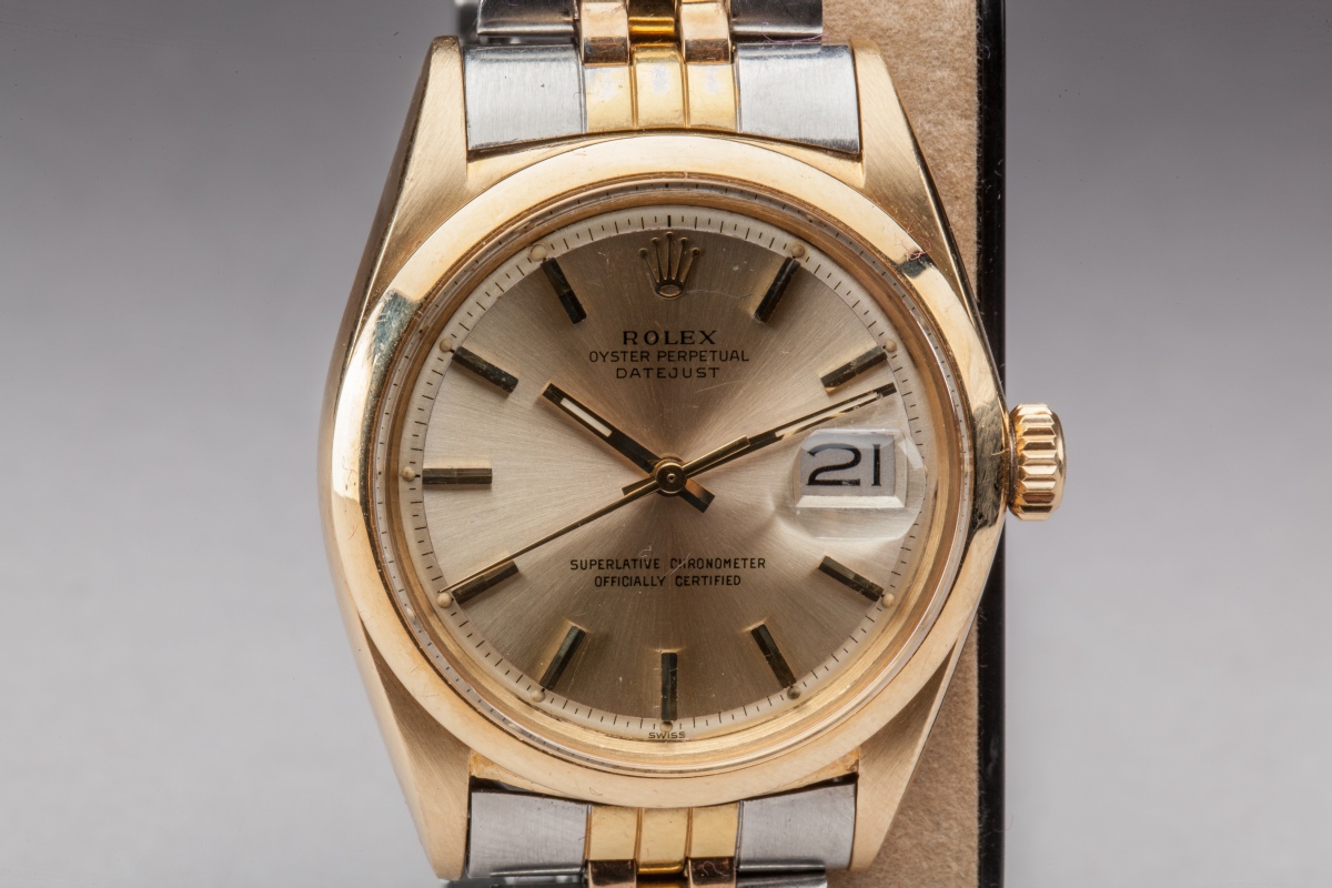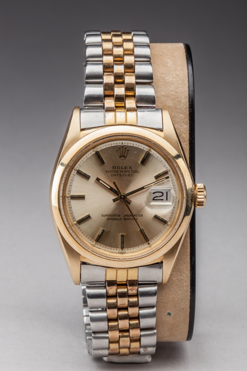 ROLEX. MONTRE OYSTER PERPETUAL DATEJUST, Superlative Chronometer Officially Certified. Boitier en or jaune, cadran gradué pour chaque demi-seconde et les heures d'un trait d'or, guichet dateur en chiffres romains à trois heures. Bracelet en acier et acier doré à boucle déployante probablement rapporté.
