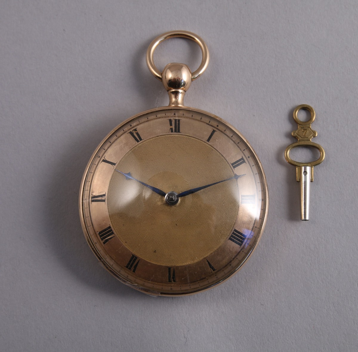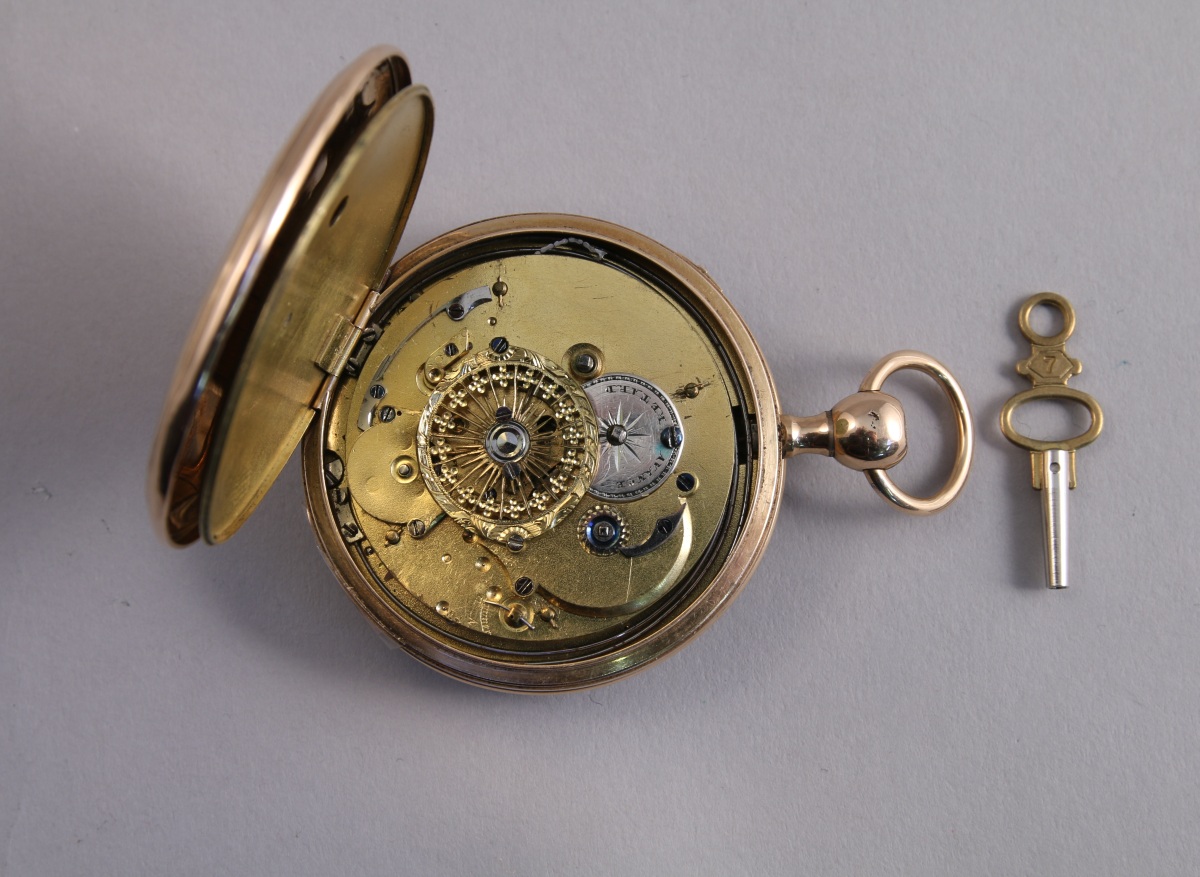 MONTRE de GOUSSET à SONNERIE des QUARTS en or rose, remontoir à clef. Le cadran guilloché indique les heures en chiffres romains, les aiguilles en acier bleui. Le boitier numéroté "28536". Cache poussière en métal doré. Mouvement à coq ajouré et ciselé, échappement à verge.