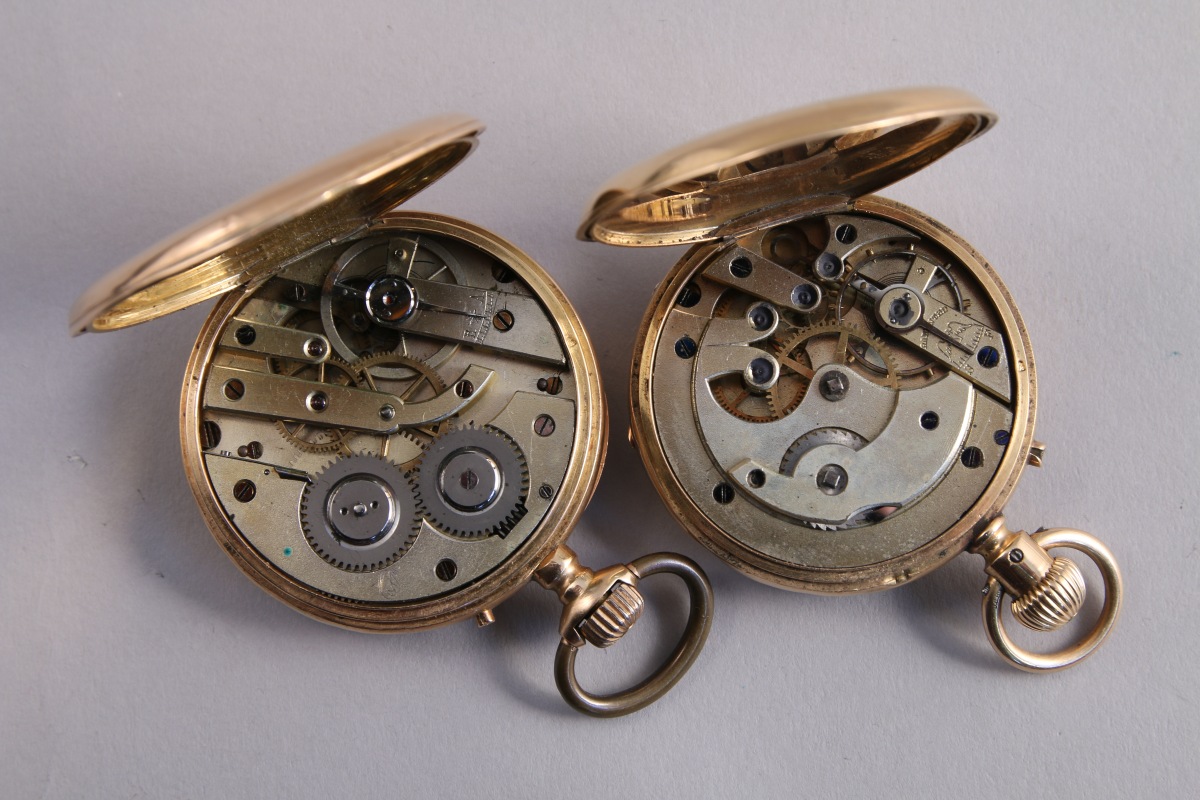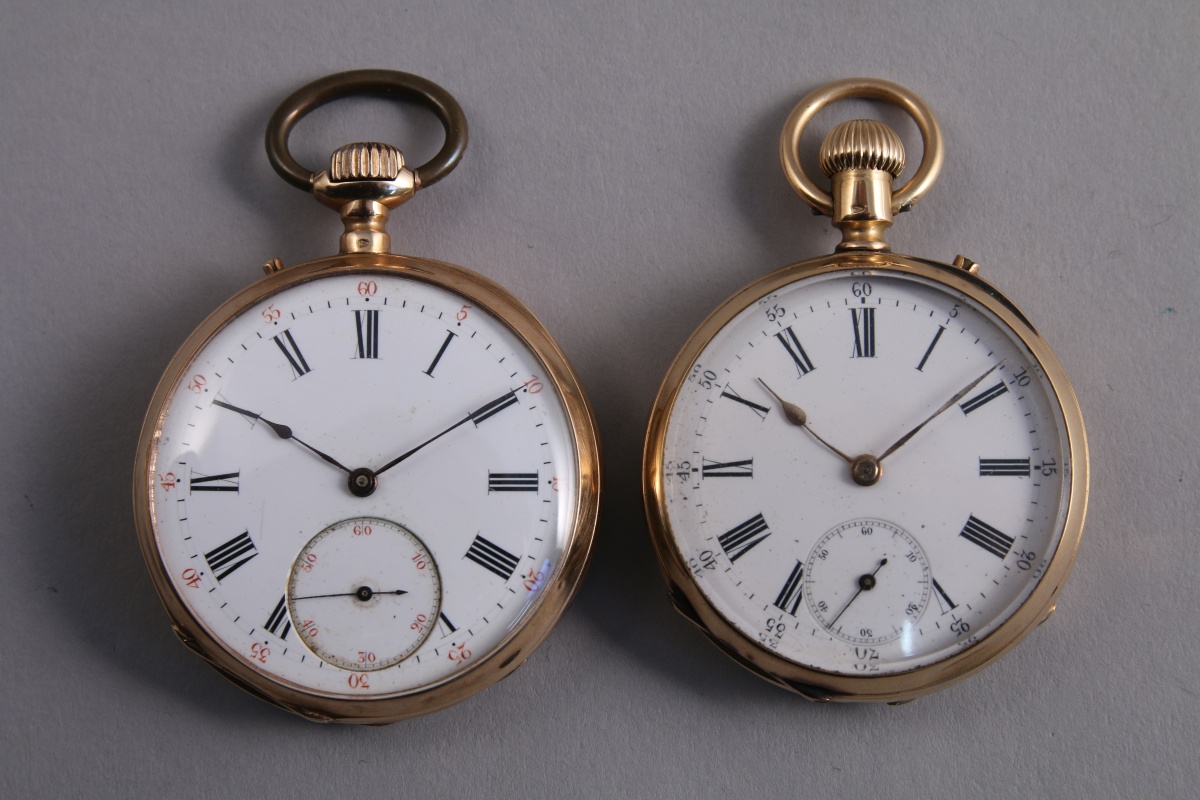 2 MONTRES de GOUSSET en or, à remontoir au pendant. Les cadrans émaillés blancs indiquent les heures en chiffres en romains et les minutes en chiffres arabes, les trotteuses à six heures.