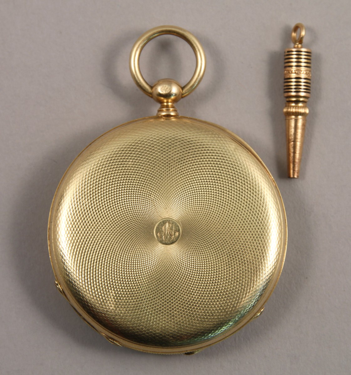 MONTRE de GOUSSET en or jaune à cadran émaillé avec les heures en chiffres romain. Avec sa clé en or jaune. Boitier guilloché et monogrammé.