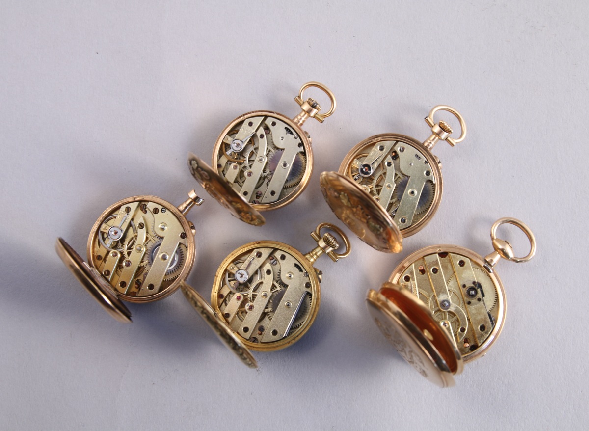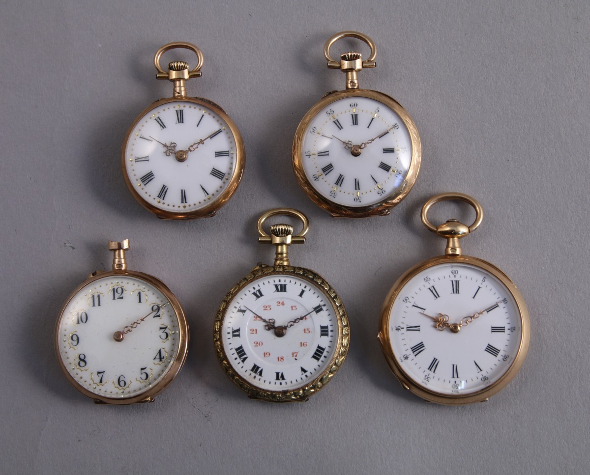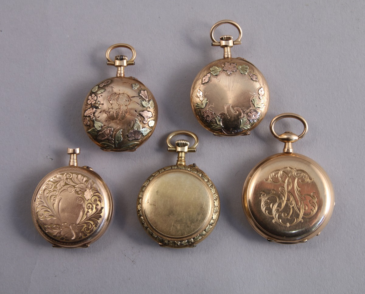 5 MONTRES DE COL en or, deux à clef, trois à remontoir au pendant. Trois présentent un décor en or de deux tons, une monogrammée "JR".