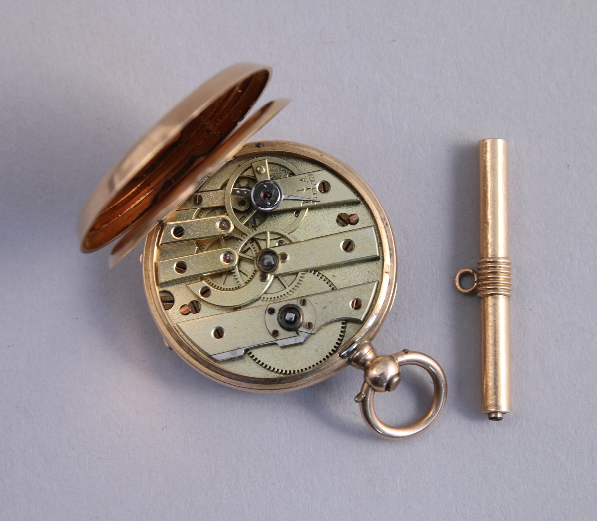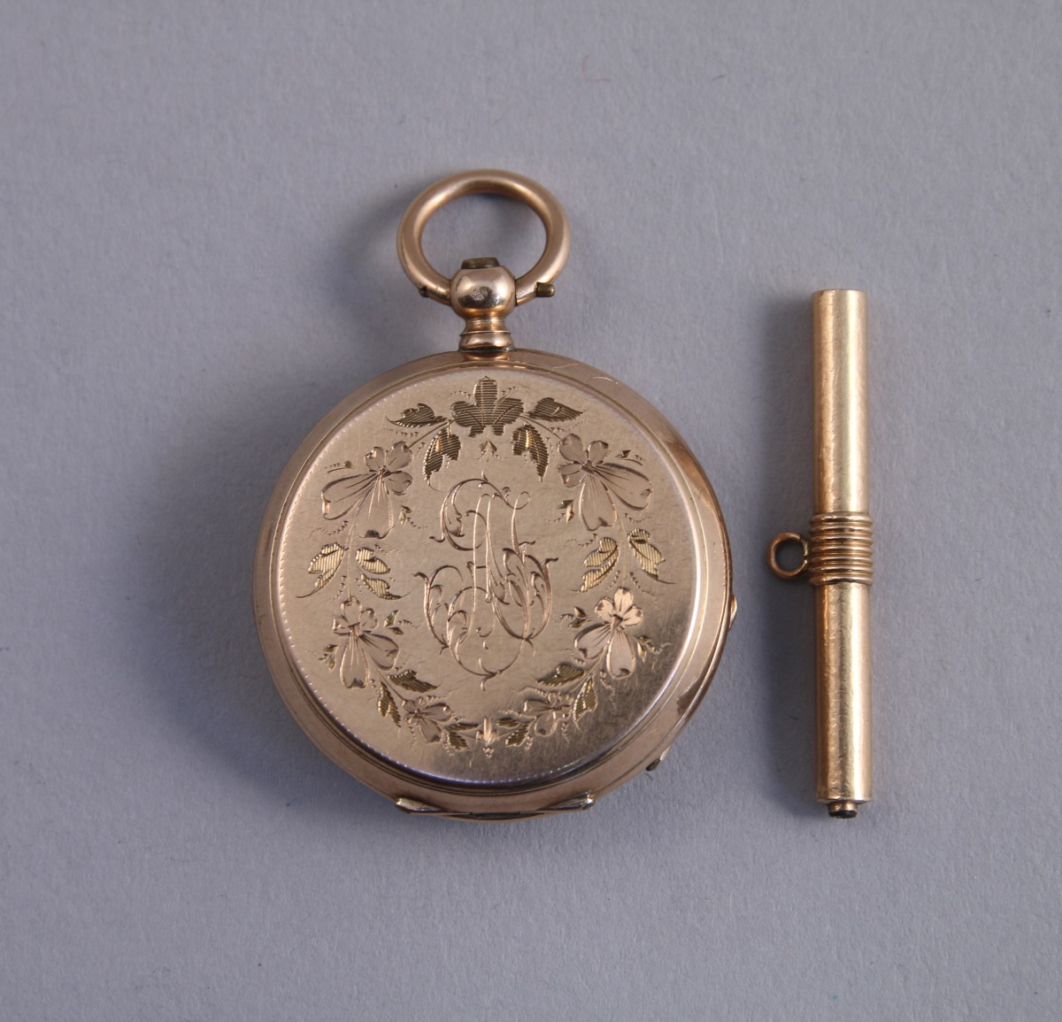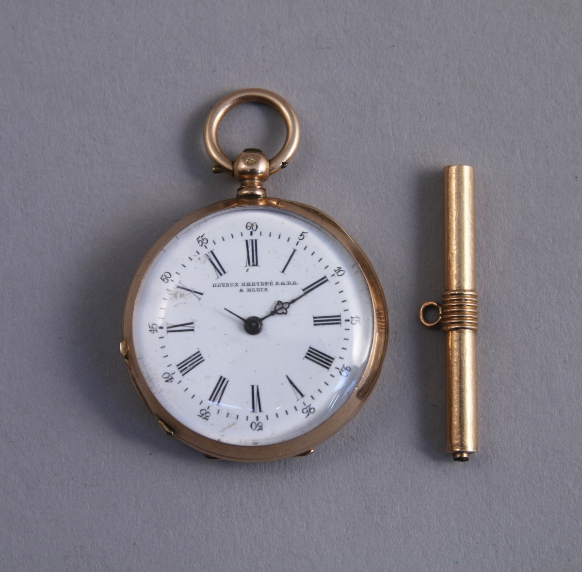 MONTRE de COL en or rose à clef. Le cadran signé "Devaux breveté S.G.D.G à Blois" indiquant les heures en chiffres romains et les minutes en chiffres arabes. Le boitier porte un monogramme ceint de fleurs au naturel et numéroté 24966. Le cache poussière porte une inscription sur un fond guilloché. Échappement à cylindre.