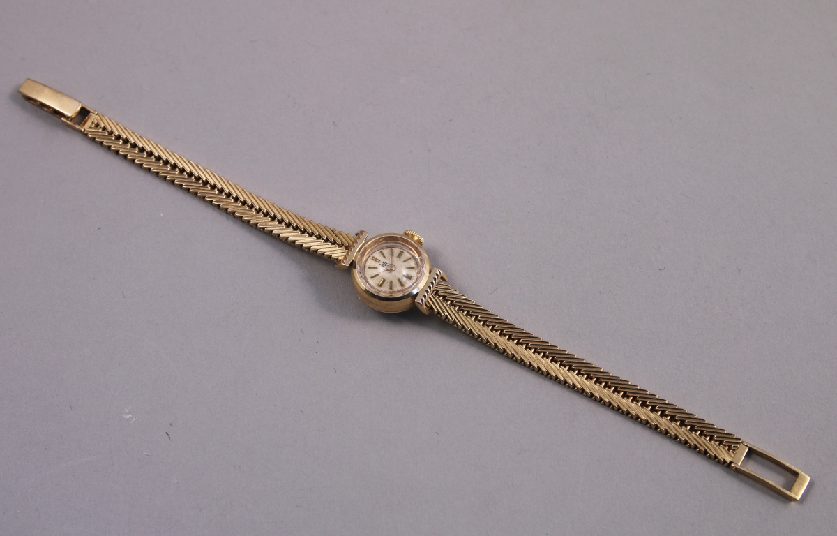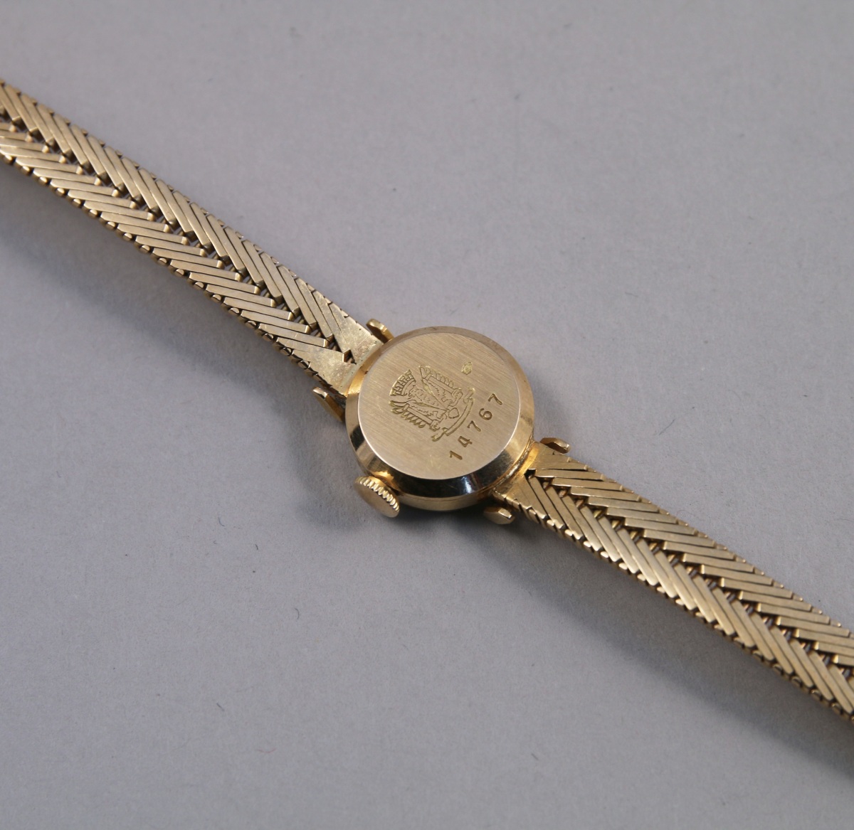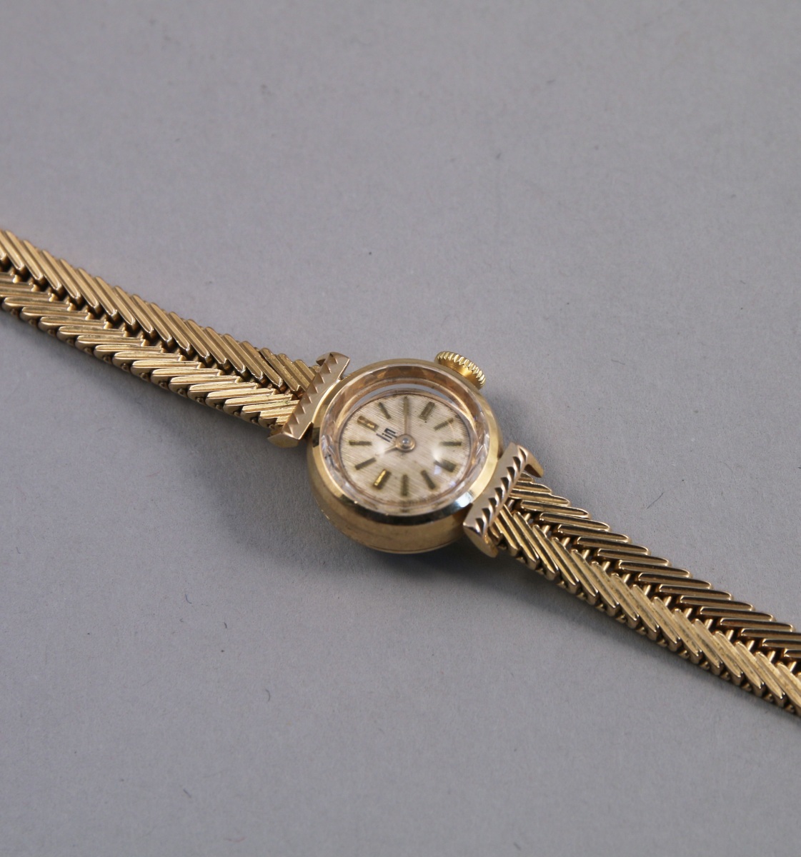 MONTRE BRACELET de DAME en or jaune, cadran signé LIP avec les heures en chiffre romains. Bracelet souple en or jaune. Boitier numéroté 14767.