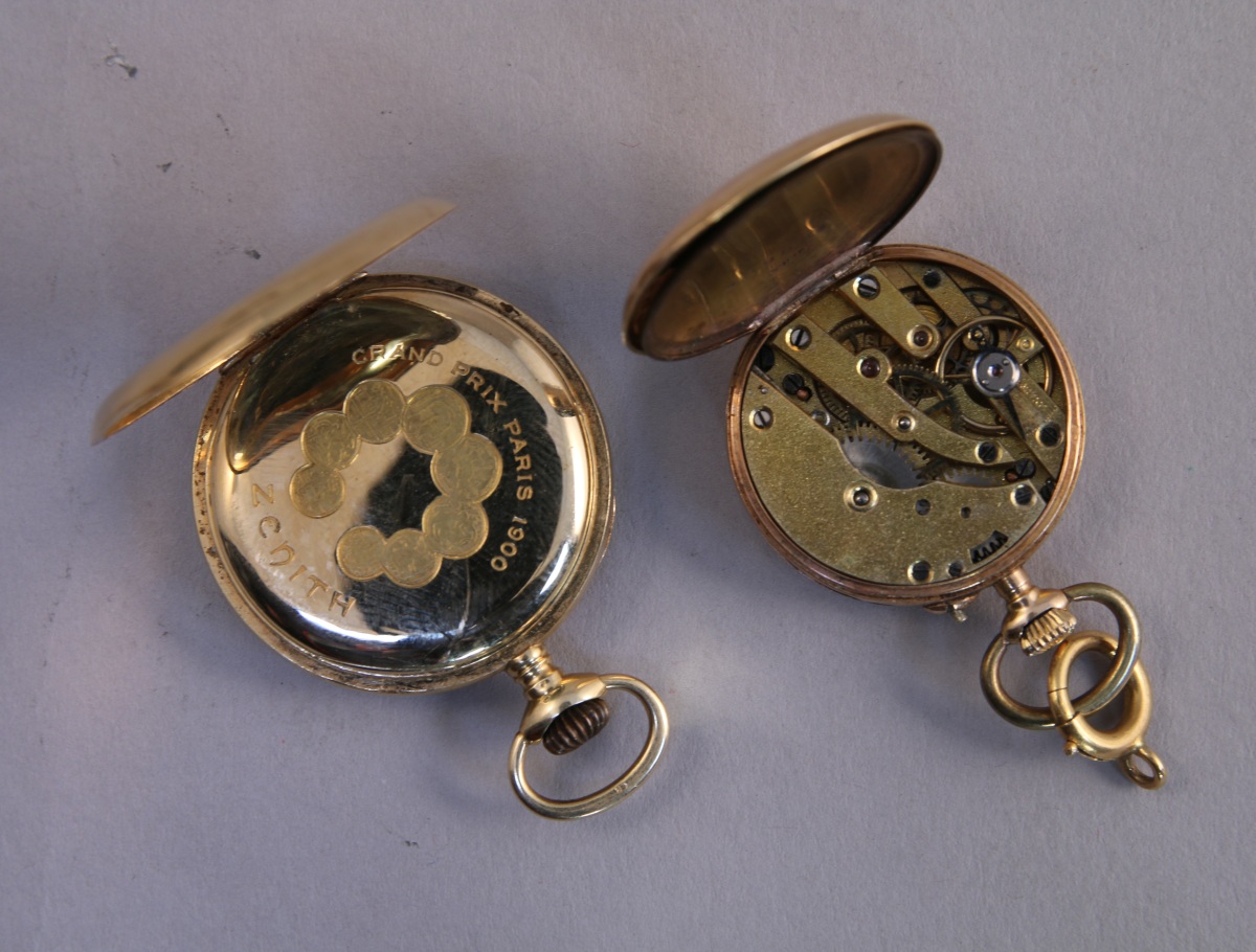 2 MONTRES de COL en or jaune, à cadran émaille, l'une à double cadran avec les heures en chiffres arabes, l'autre avec les heures en chiffres romains. Remontoirs.