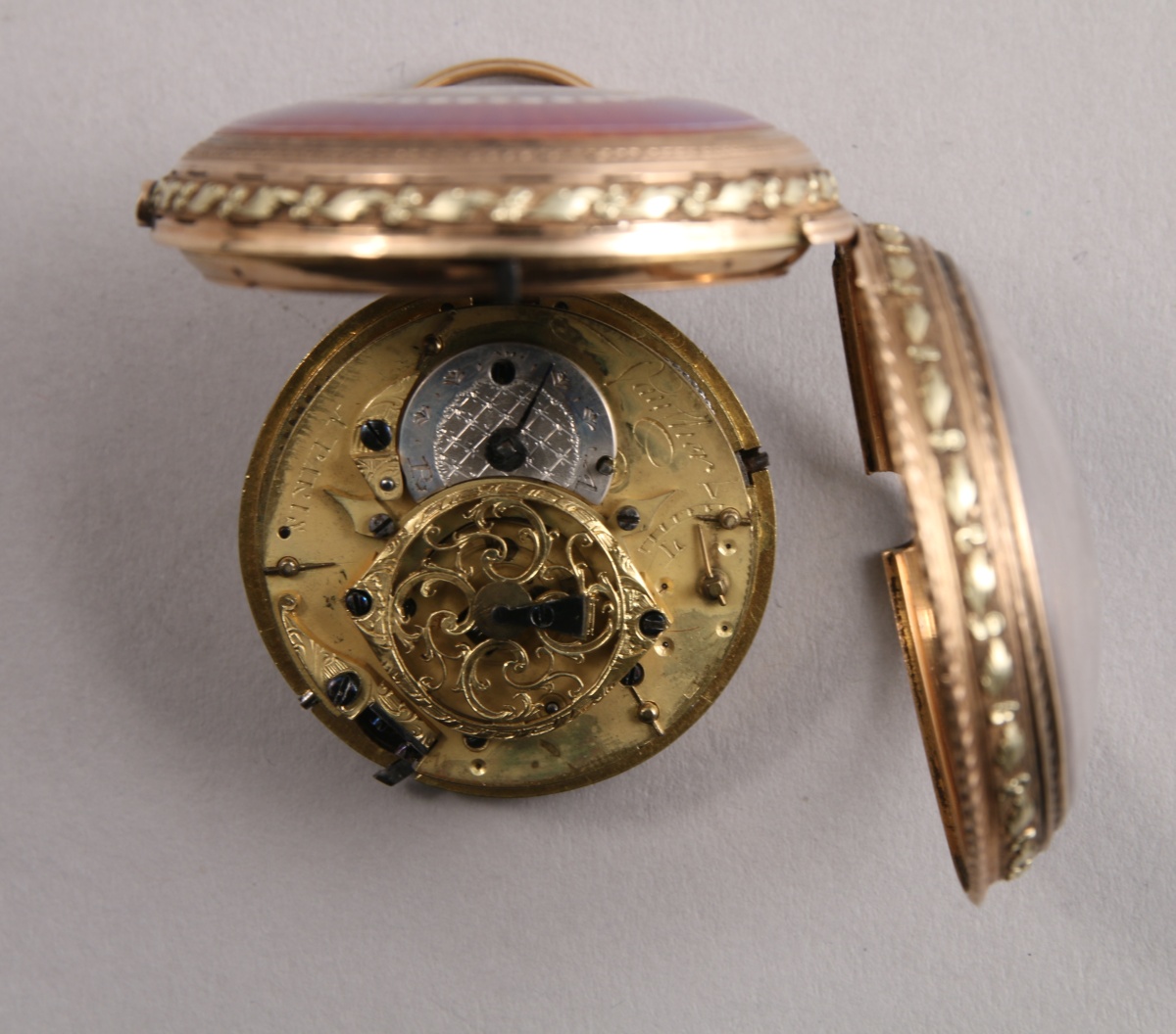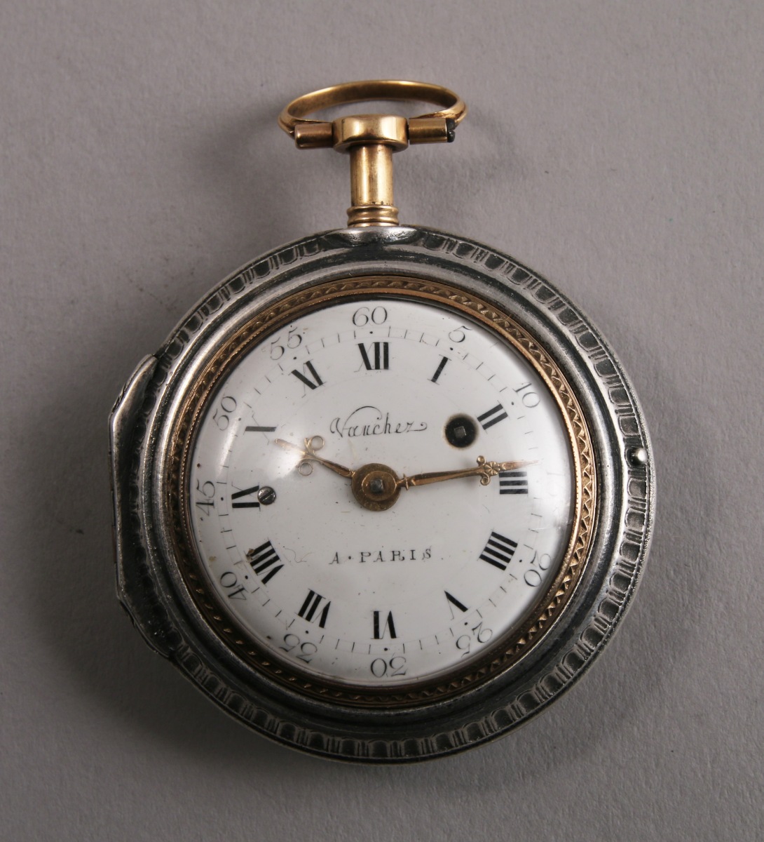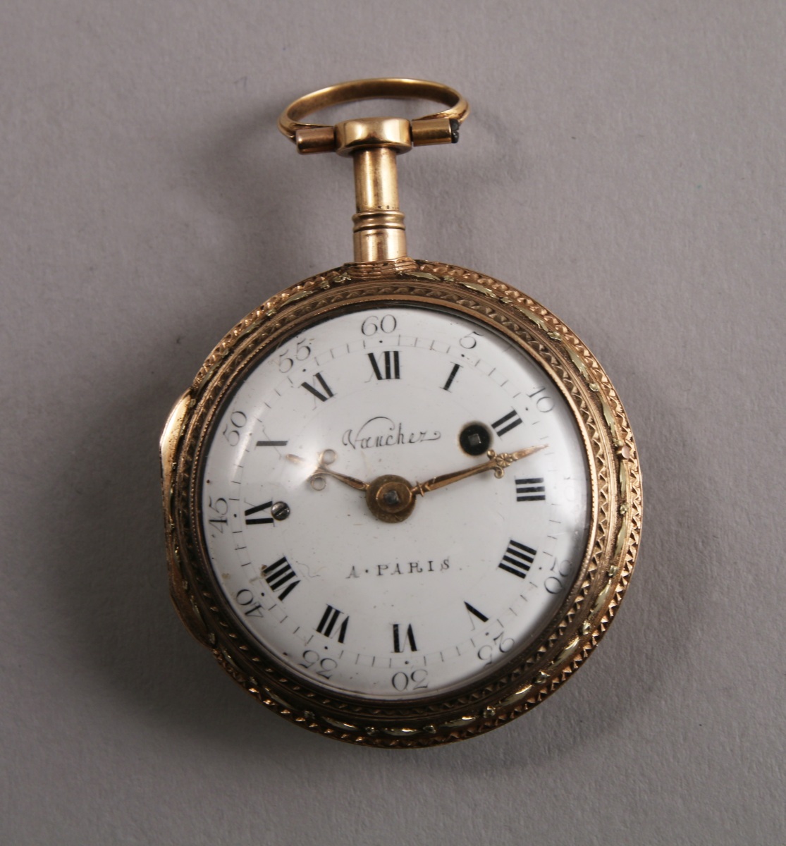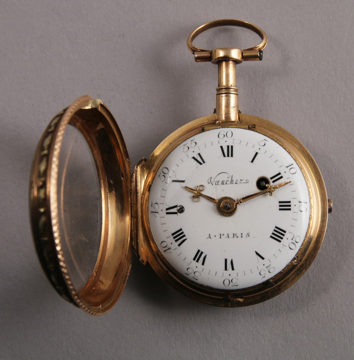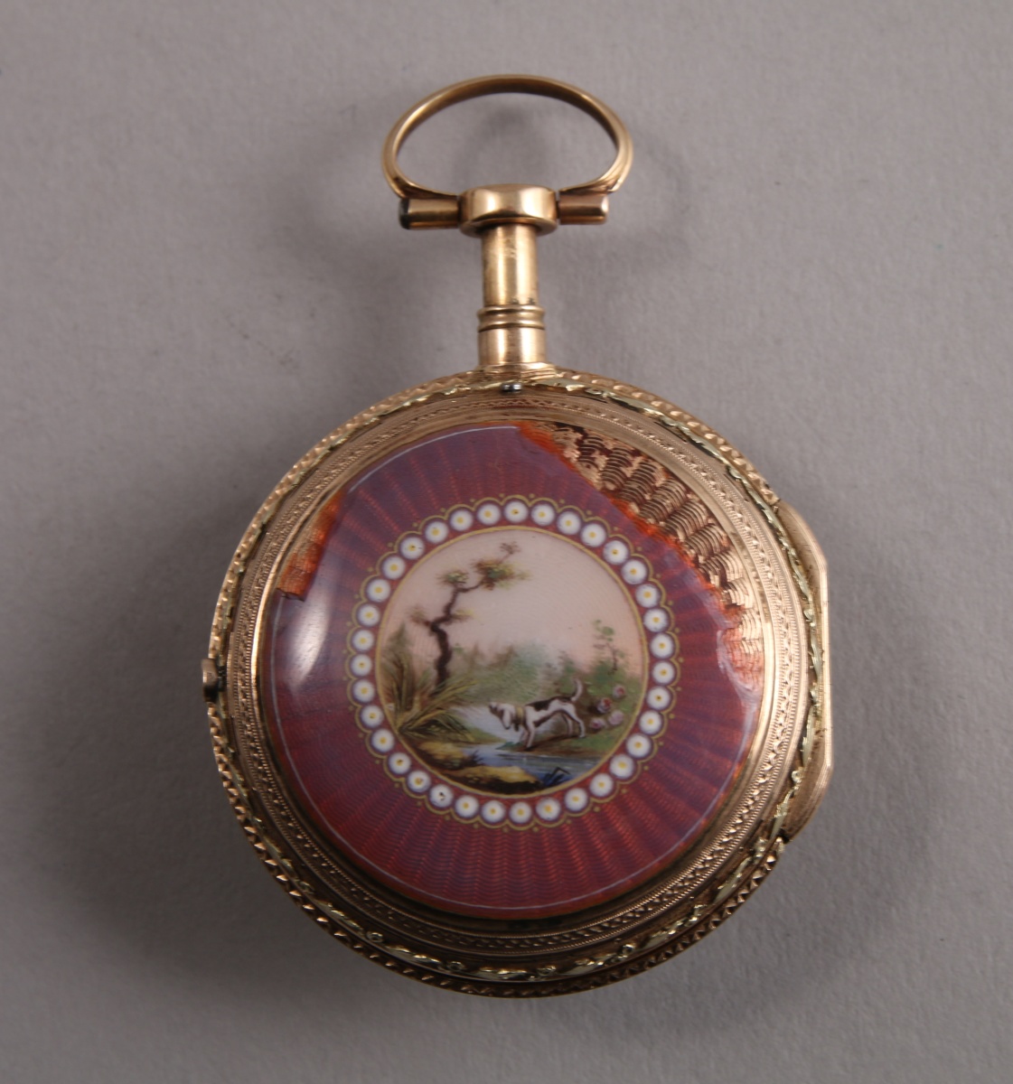 MONTRE À COQ en or de deux tons À SONNERIE À LA DEMANDE, heures et quarts, deux marteaux. La tranche ciselée de frises ondées et frises feuillagées. Le dos du boîtier émaillé translucide d'une miniature figurant un chien au bord d'un ruisseau dans un encadrement d'émail guilloché (manques). Cadran émaillé blanc à chemin de fer indiquant les heures en chiffres romains et les minutes en chiffres arabes signé "Vaucher à Paris". Le coq ciselé de rinceaux. Mouvement signé. Cerclage de protection en argent.