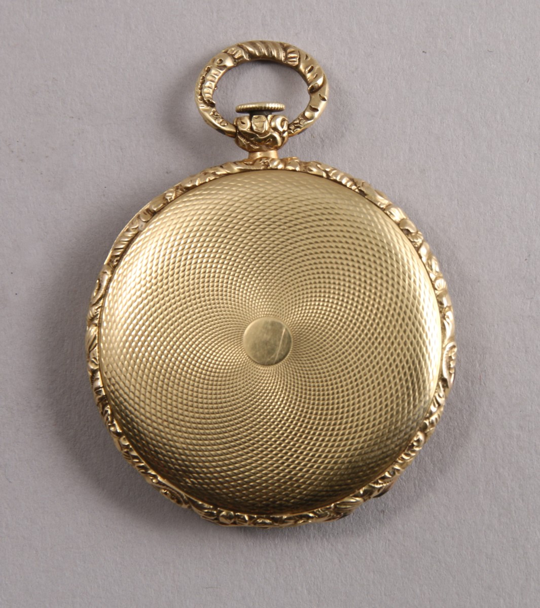 MONTRE de GOUSSET en or jaune à clef. La tranche ciselée de feuillages stylisés, dos guilloché.