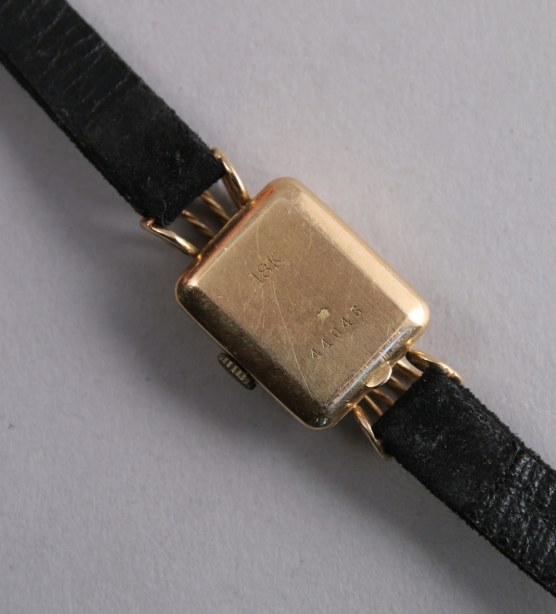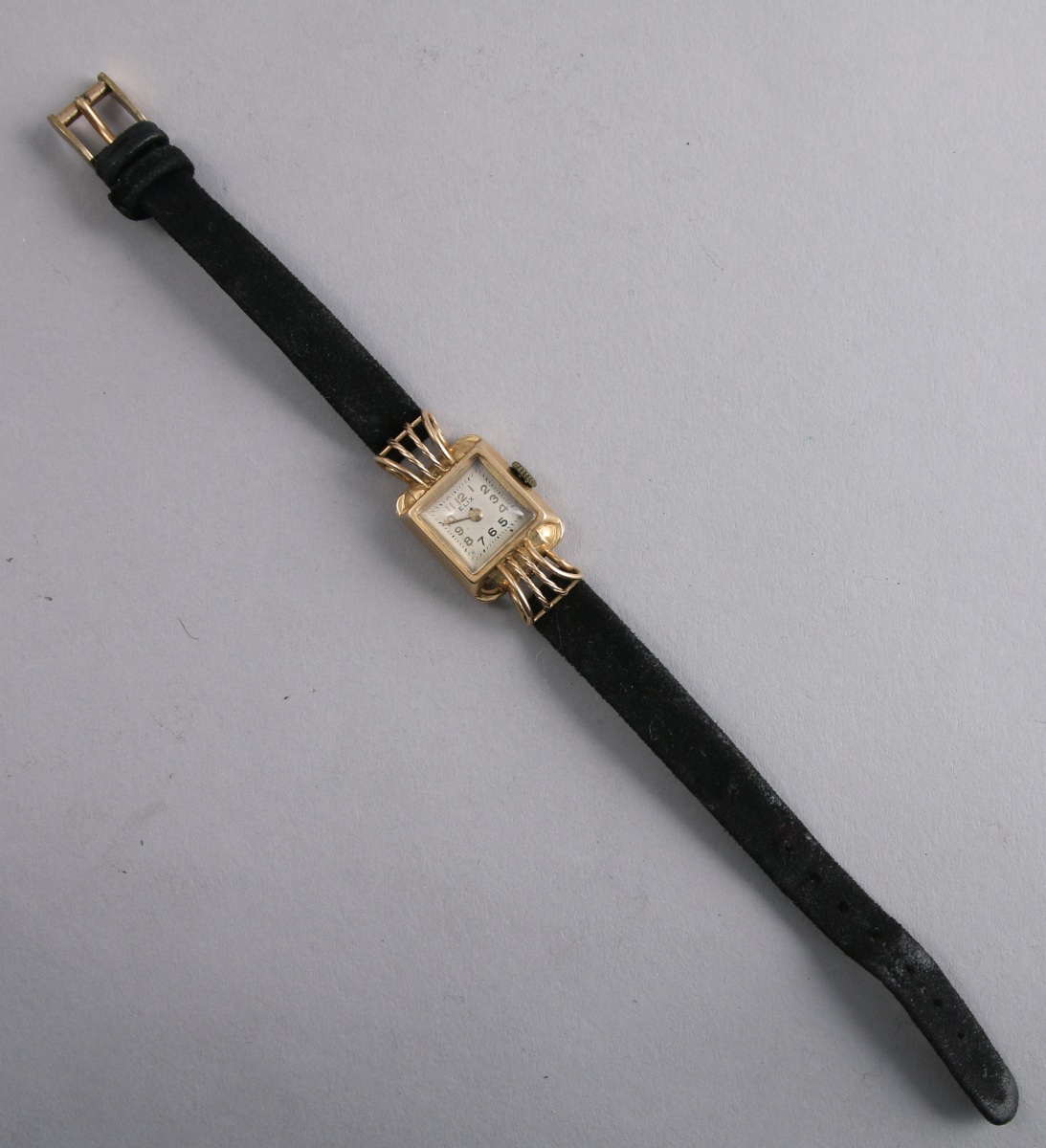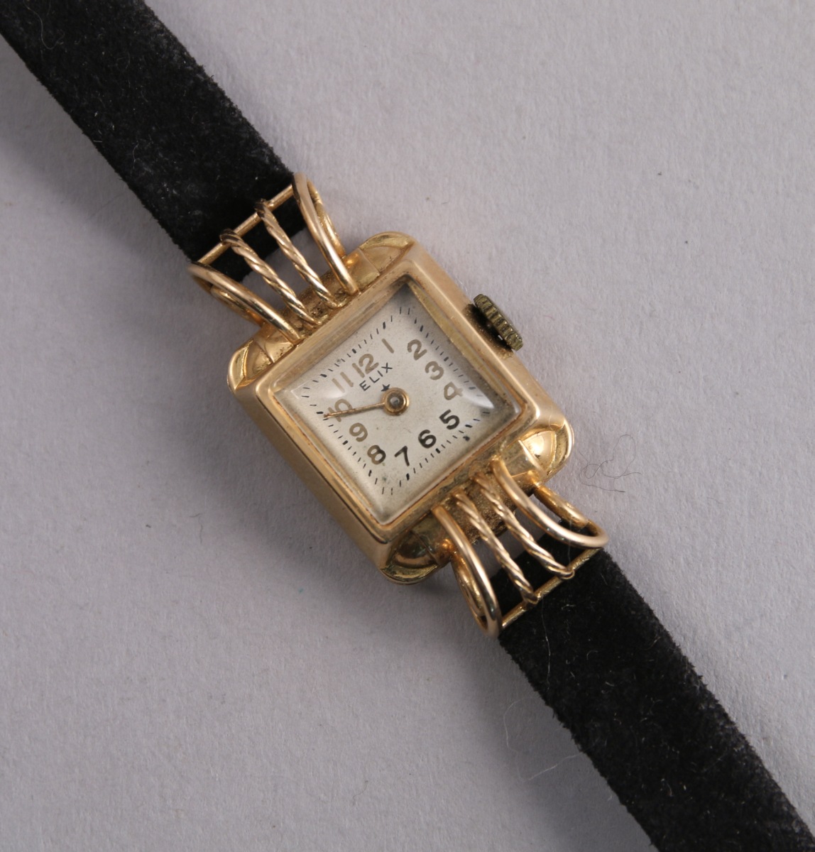 MONTRE BRACELET de DAME en or jaune, le remontoir à 3 heures. Le boitier de forme rectangulaire avec les charnières à la façon d'un chapiteau ionique. Le cadran avec les heures en chiffres arabes marqué Elix. Bracelet en velours noir.