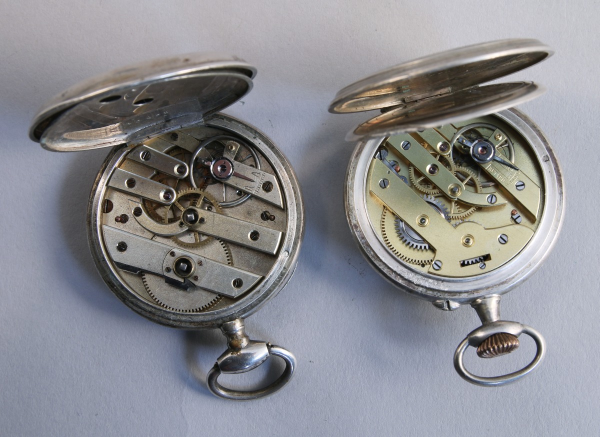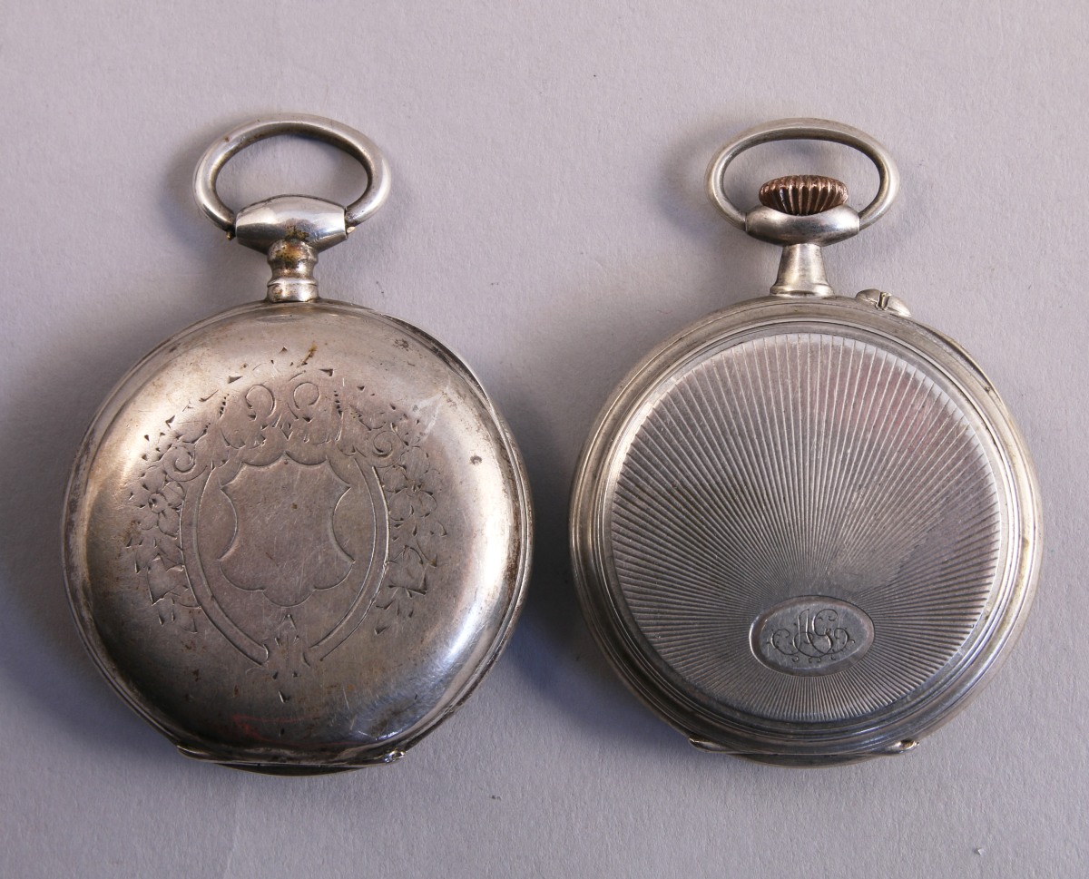 2 MONTRES de GOUSSET en argent, l'une à clef, l'autre à remontoir au pendant et double cadran, le cache poussière porte l'inscription "Médaille d'or Paris 1900". Poinçon crabe.