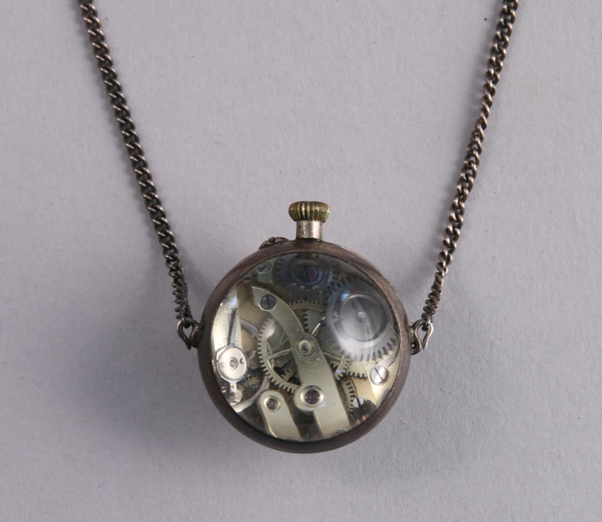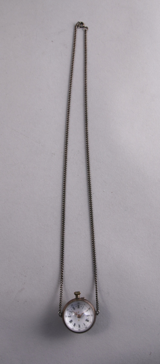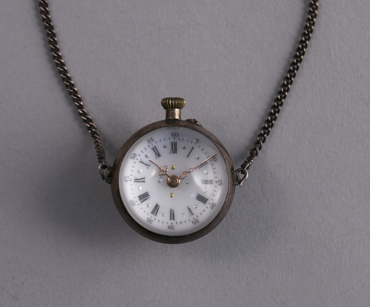 MONTRE BOULET à remontoir au pendant en argent à verres bombés grossissants. Cadran émaillé blanc indiquant les heures en chriffres romains et les minutes en chiffres arabes. Elle est retenue par un chaîne.