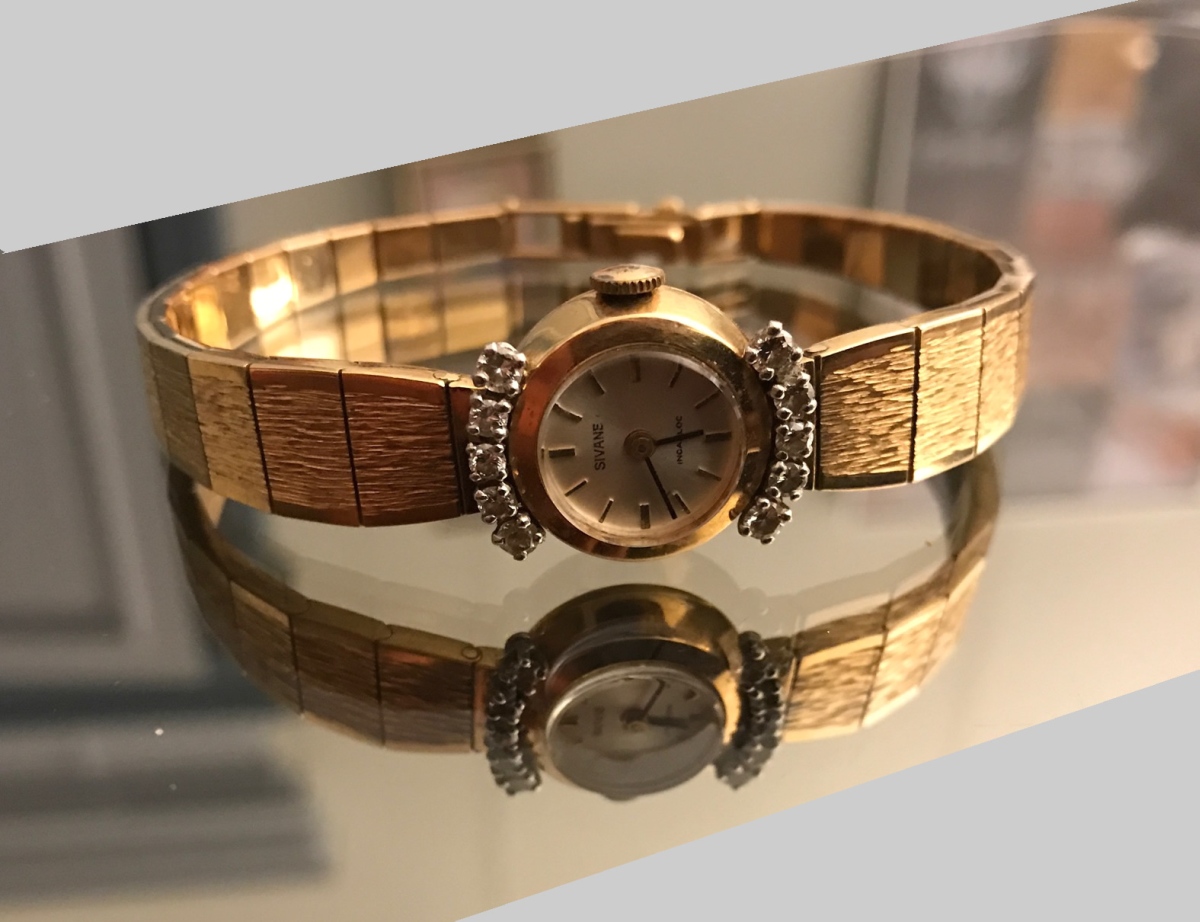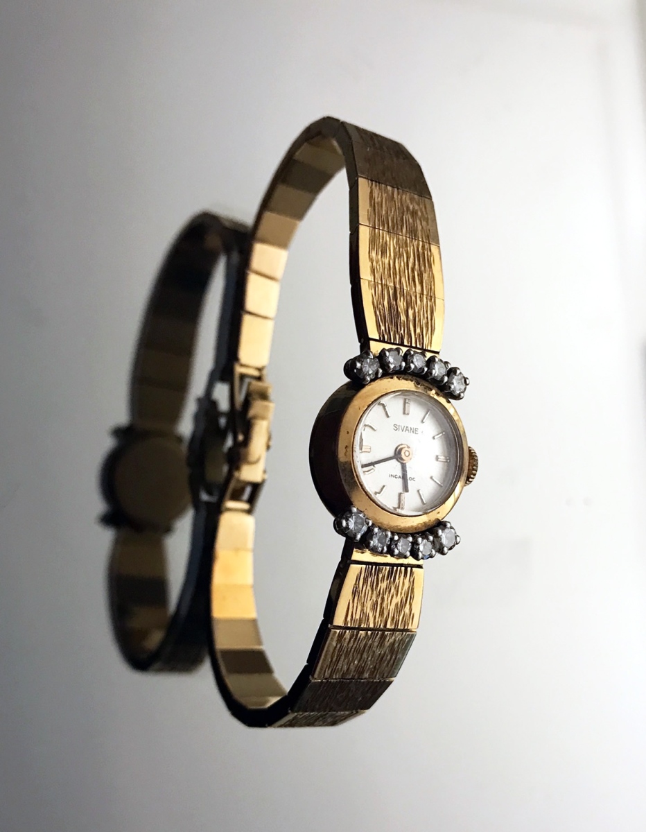 Belle MONTRE BRACELET de DAME en or jaune, la lunette ornée deux fois de 5 diamants en ligne, le cadran signé Swann Incabloc. Le remontoir à 3h. Bracelet en or jaune articulé à la façon de l'écorce.