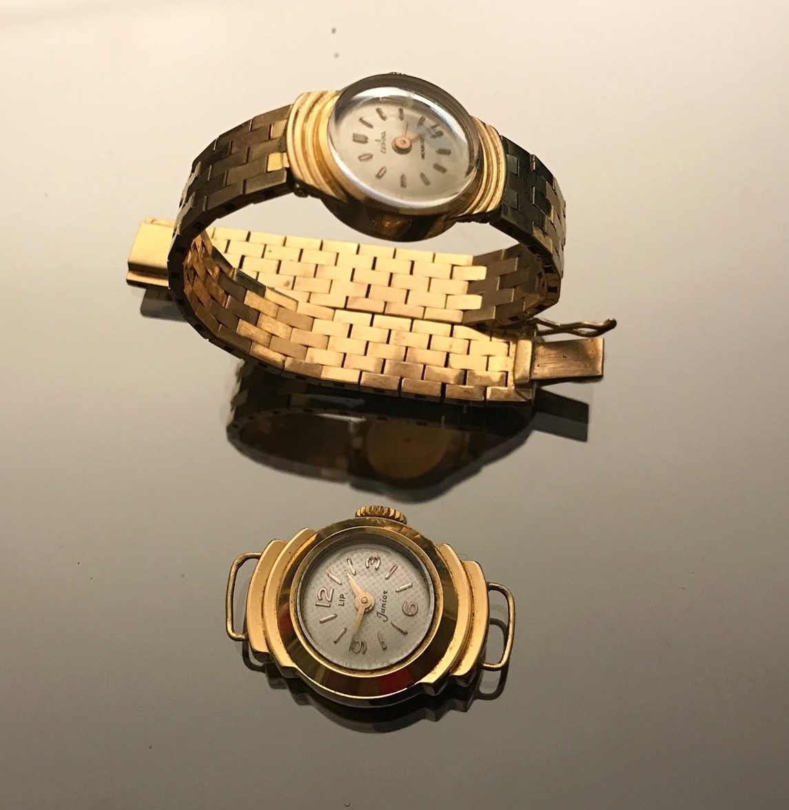 JOINT : LIP. MONTRE BRACELET de dame, avec les heures en chiffres arabes et les aiguilles en or, le remontoir à 3 h. Diam. 1,5 cm, Poids brut : 9,2 g.