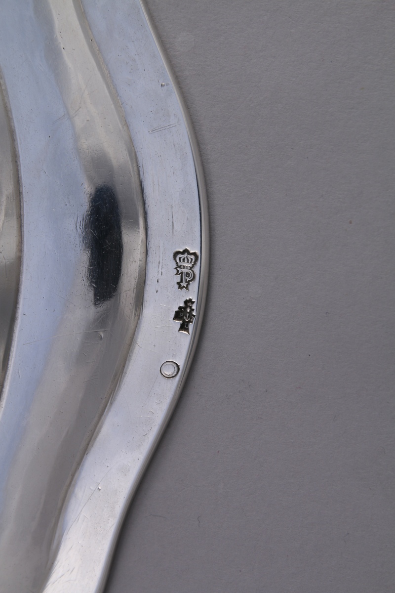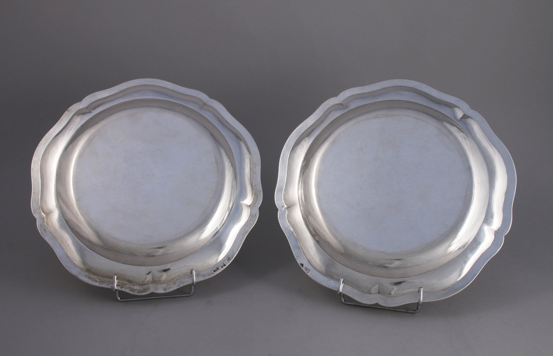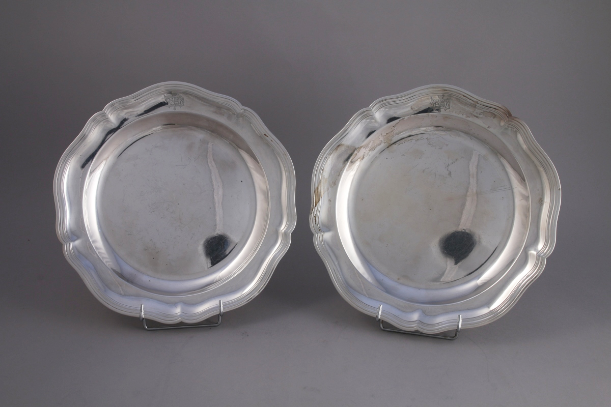 PARIS. Paire de PLATS de forme ronde en argent à battes-contours. L'aile gravée (probablement postéreurement) d'armes d'alliance timbrées d'une couronne comtale et soutenues par des griffons. Celles de senestre sont celles de la famille de La Motte Saint Pierre.
