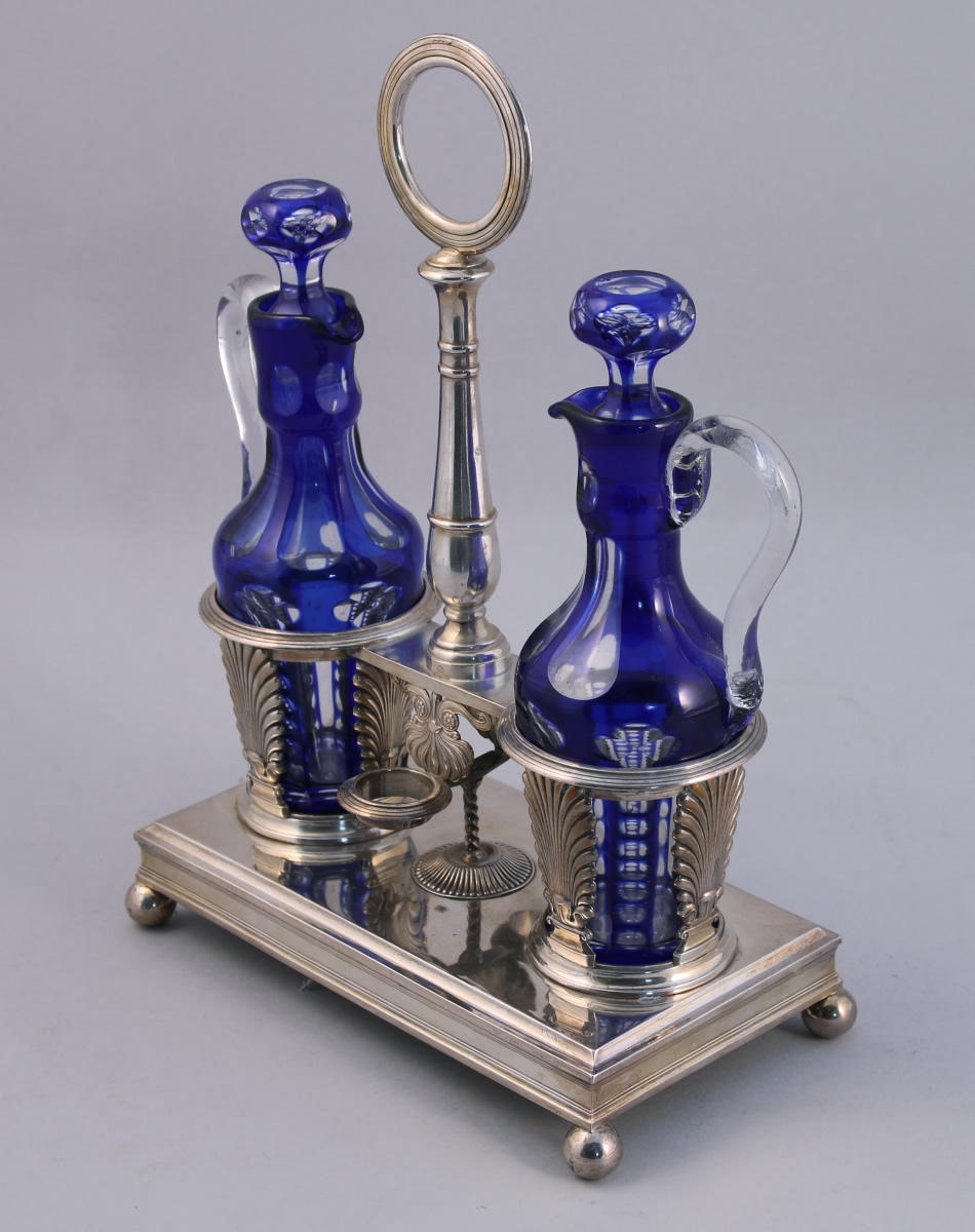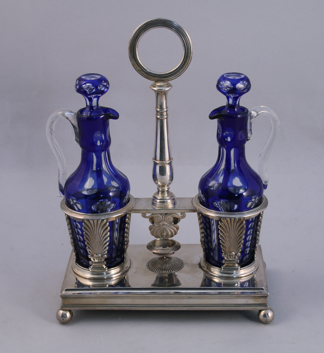 PARIS. HUILIER-VINAIGRIER en argent. La terrasse de forme rectangulaire repose sur quatre pieds boule. Les porte-carafons à décor ajouré de palmettes. Les repose-bouchons à attache palmette flanquée d'enroulements fleuronnés. Prise de forme ronde à l'amortissement d'un balustre.