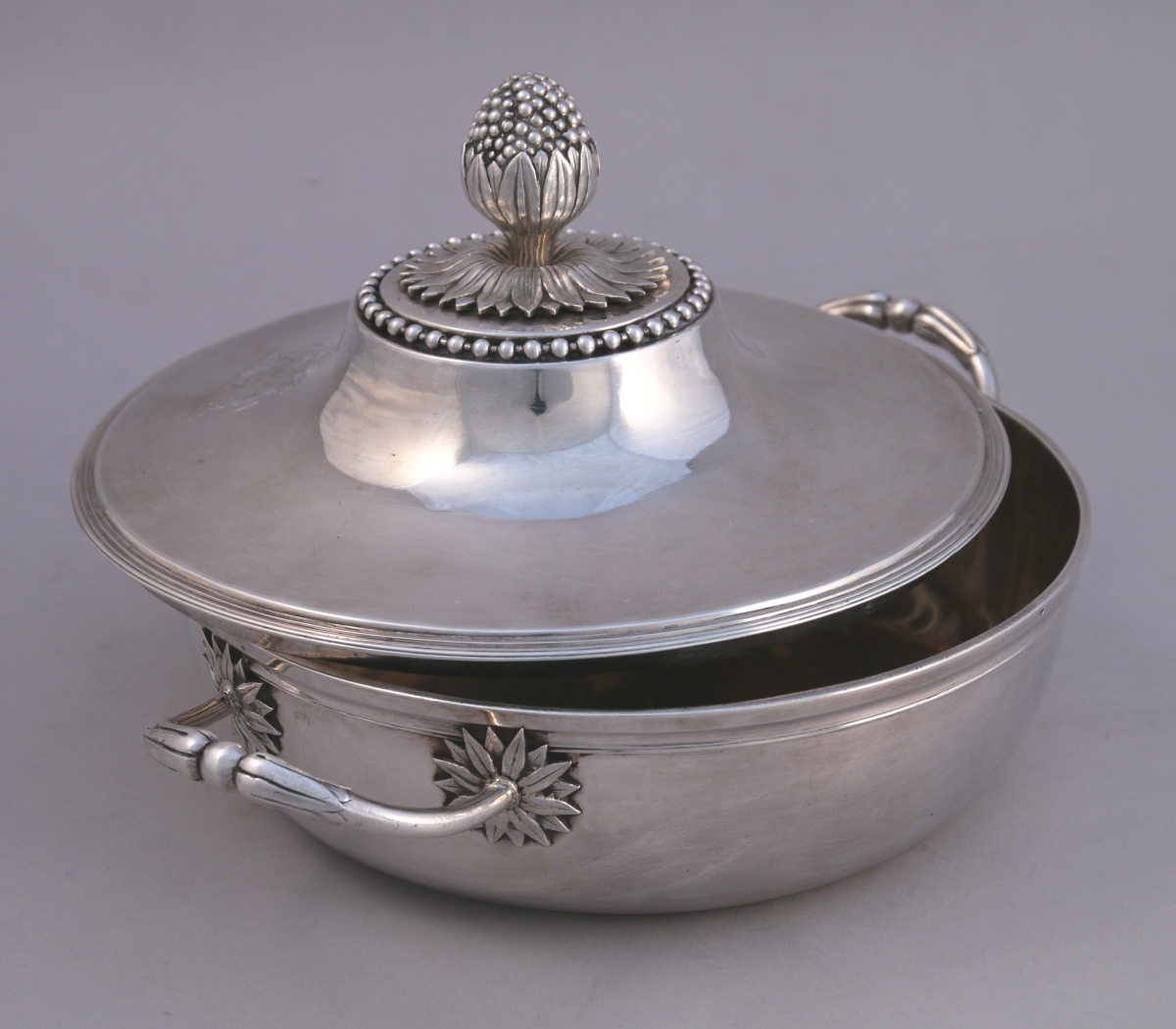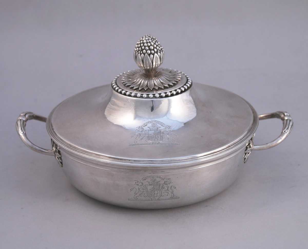 PARIS. LÉGUMIER couvert en argent. Anses latérales à attaches fleuronnées. Couvercle à doucine appliqué d'un rais de perles. Le fretel en graine reposant sur une terasse de feuilles lancéolées rayonnantes. Le couvercle et le corps gravés des armoiries de la famille de Samson (Maine) timbrées d'une couronne marquisale et supportées par des lions.