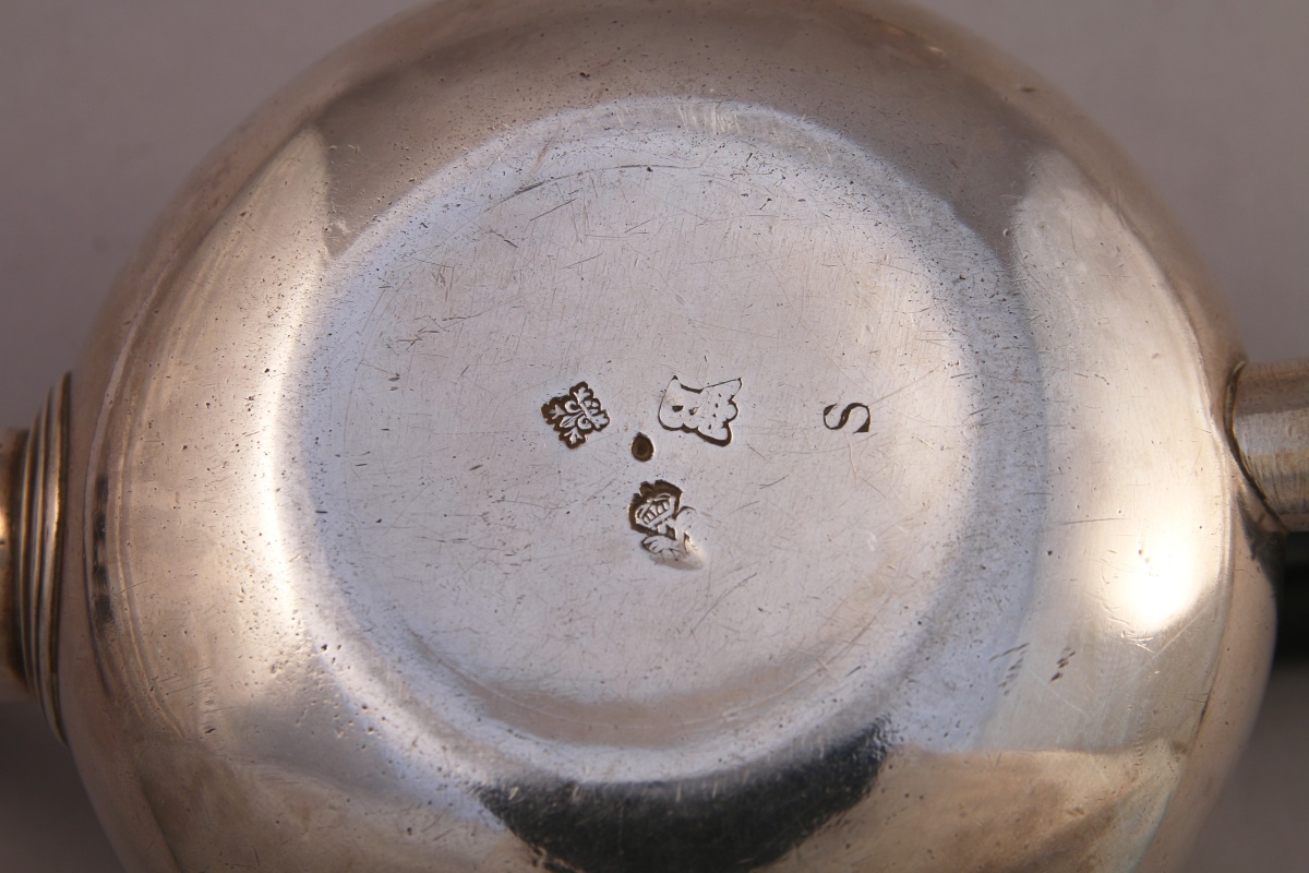 Haut. 8, Long. 13,5 cm. Poids brut : 300 g. (manque le fretel, petites soudures aux attaches de l'anse, petits chocs)