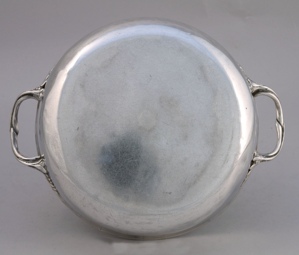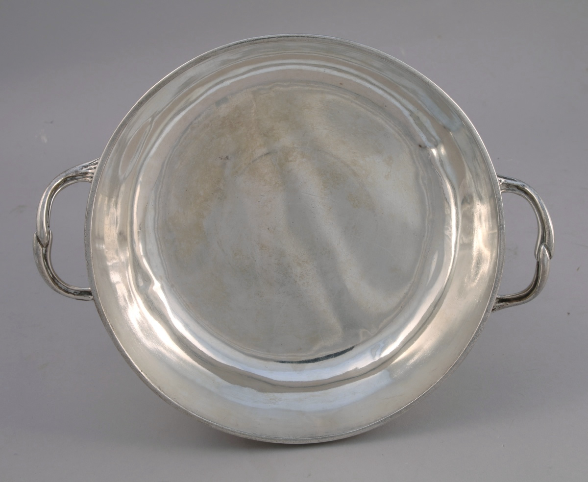 PARIS. LÉGUMIER en argent uni. Anses latérales à attaches feuillagées. Le corps gravé d'armes d'alliances timbrées d'une couronne comtale.