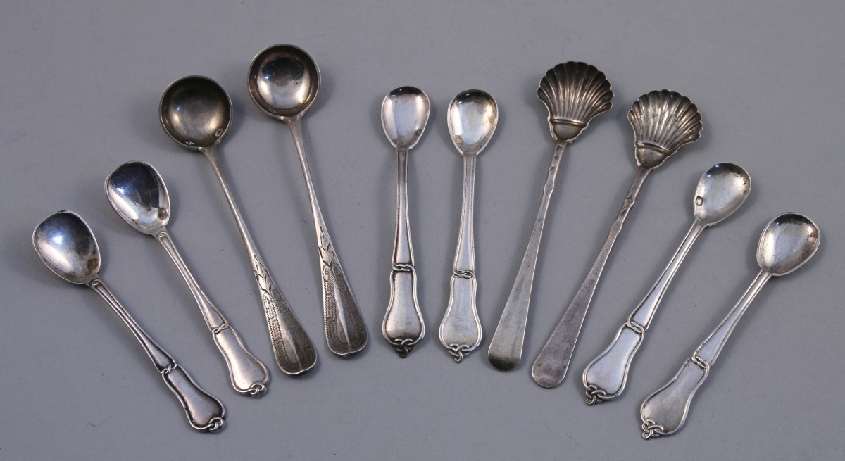 PARIS. RÉUNION de 8 PELLES à SEL et d'une paire de CUILLÈRES à MOUTARDE en argent :