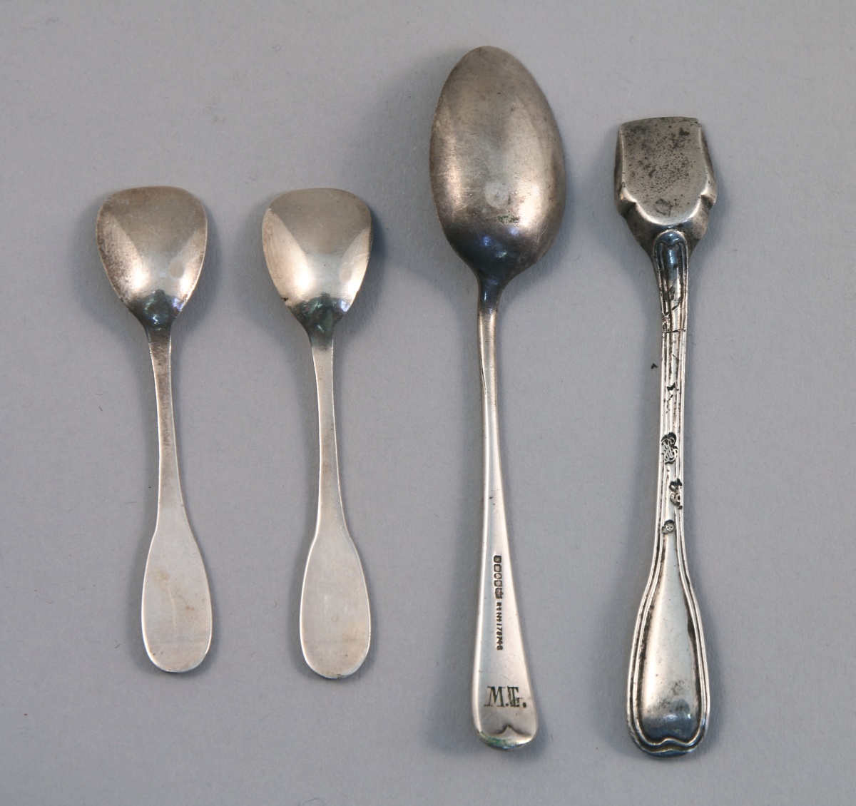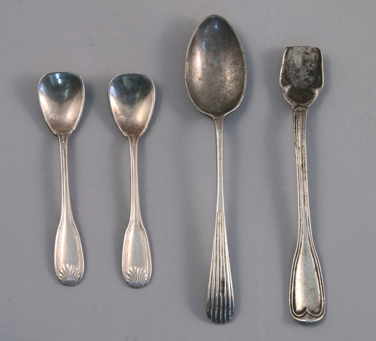 JOINT : paire de CUILLÈRES À SEL en métal argenté, modèle filets-coquille et CUILLÈRE À MOKA en métal argenté, spatule godronnée.