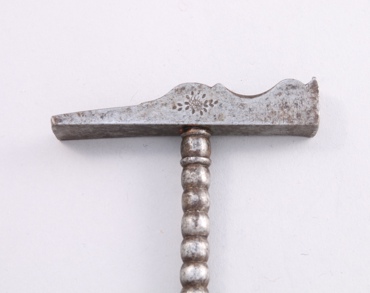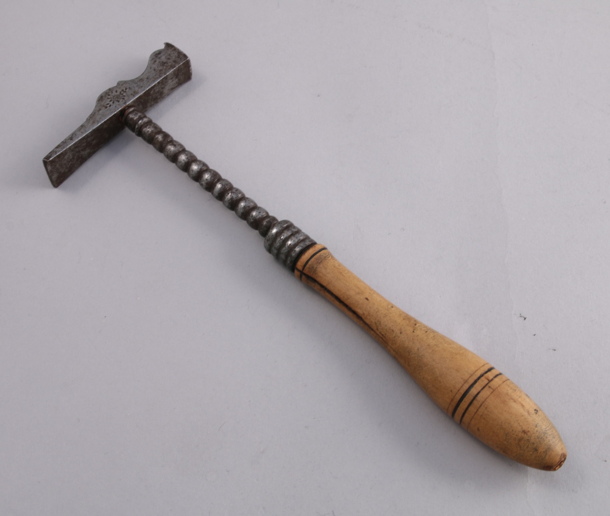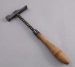 MARTEAU d'ORFÈVRE en fer forgé. Rive supérieure chantournée et chanfreinée à motif floral. Manche en fer tourné en chapelet, terminé par une poignée en bois.
