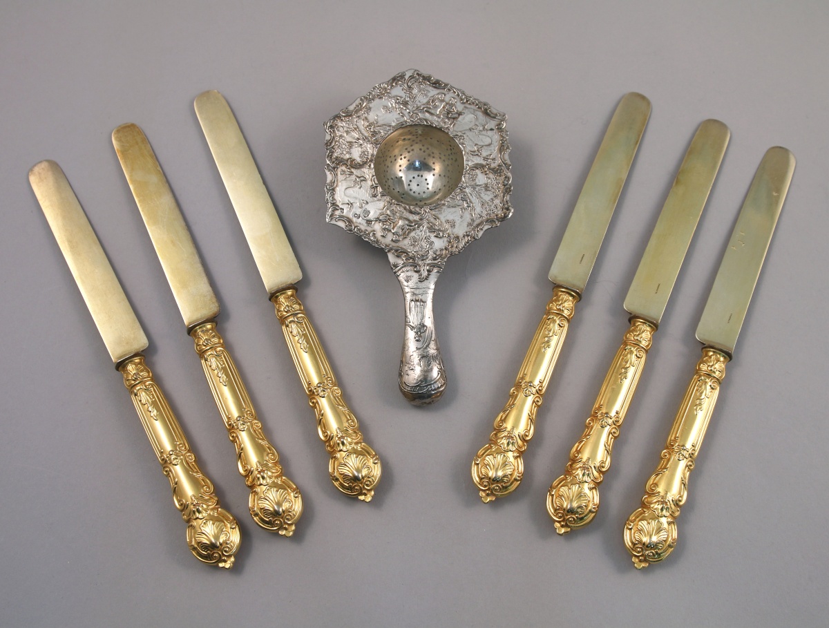 JOINT : Suite de 6 COUTEAUX À FRUITS les lames en vermeil et les manches fourrés en métal doré à décor de coquilles. Travail étranger du XIXe. Haut. 20,4 cm. Poids brut : 270 g.