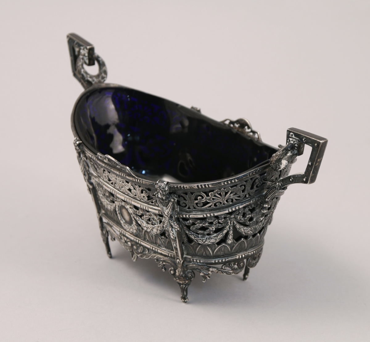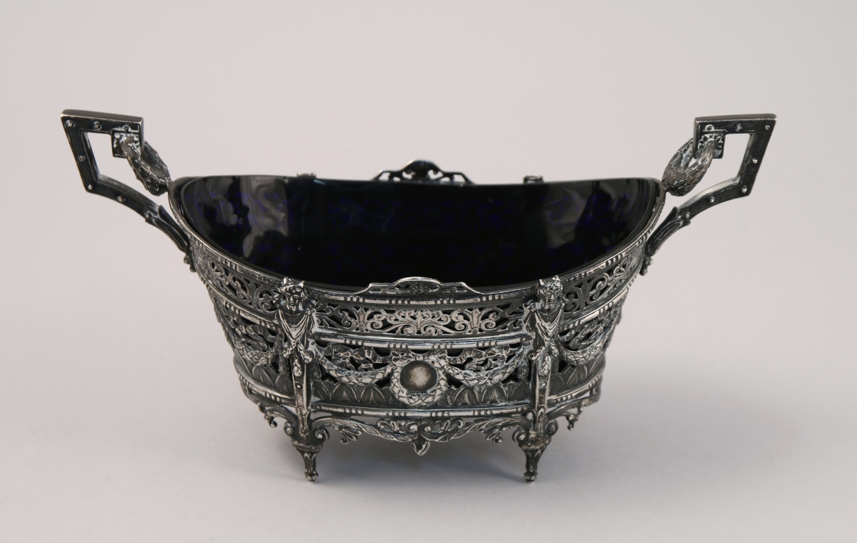 ROYAUME-UNI. COUPE en argent et sa doublure en verre bleu à riche décor ajouré d'enroulements, guirlandes de lauriers, nuds rubanés, frise de feuilles lancéolées, feuillages stylisés et faunes gainés. Deux anses latérales. Elle repose sur quatre pieds fuselés.