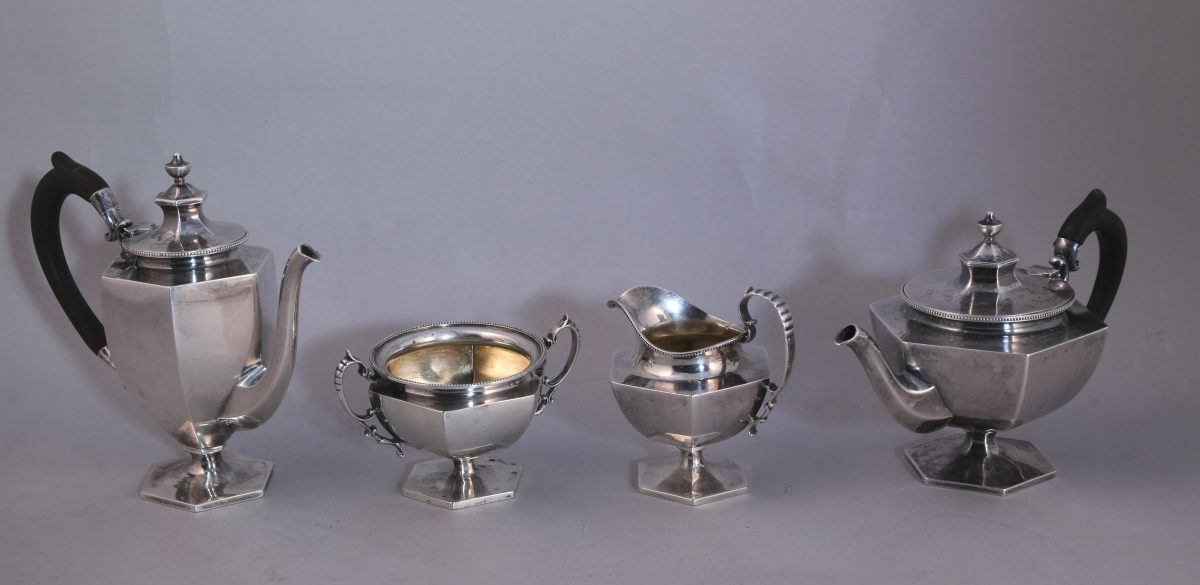 U.S.A. SERVICE à THÉ-CAFÉ dit égoïste en argent, 4 PIÈCES, à pans et côtes saillantes reposant sur un piédouche hexagonal. Les cols soulignés d'un rais de perles. Anses en bois noirci. Il se compose d'une cafetière, d'une théière, d'un sucrier et d'un pot-à-lait.