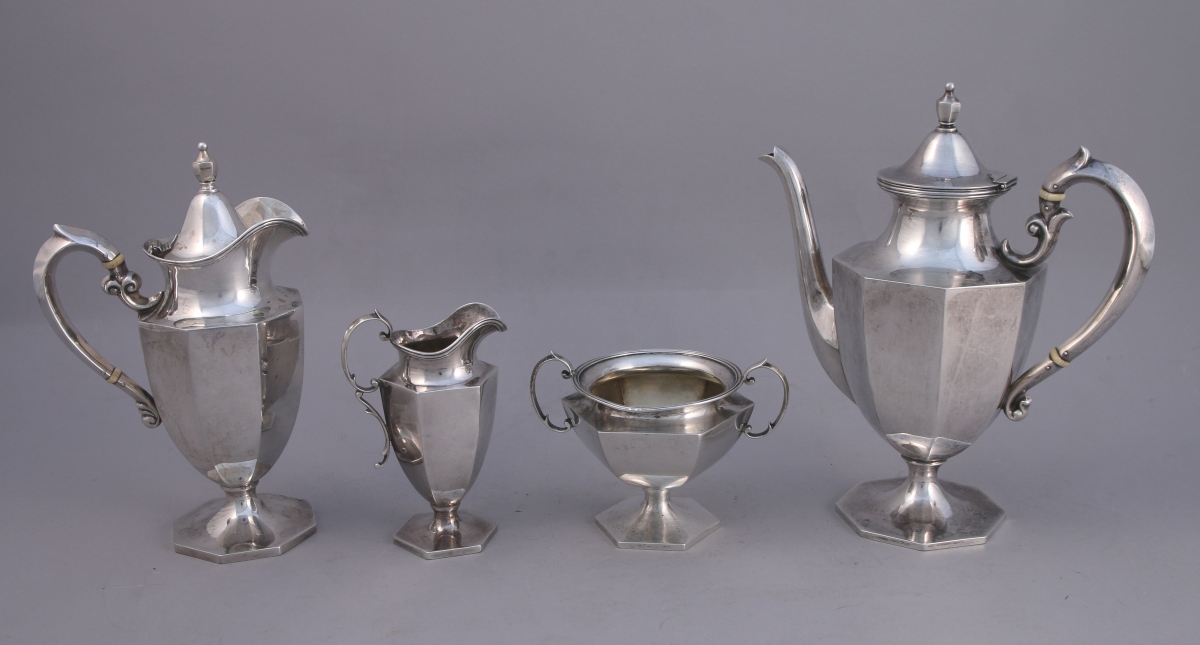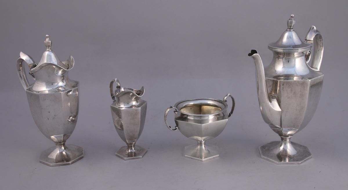 U.S.A. SERVICE à THÉ en argent, 4 PIÈCES, à pans et côtes saillantes reposant sur un piédouche hexagonal ou octogonal. Les cols soulignés de filets. Anses baguées. Il se compose d'une théière, d'une verseuse, d'un sucrier et d'un pot-à-lait.