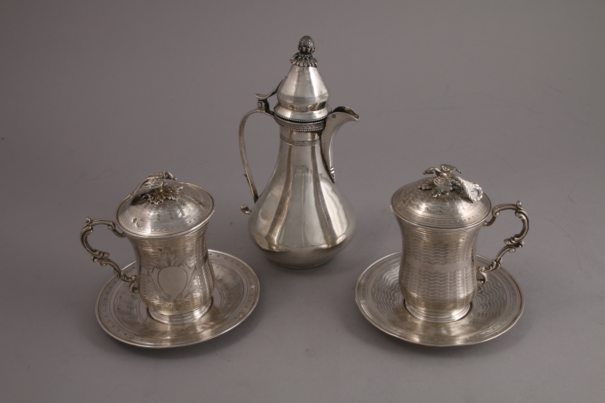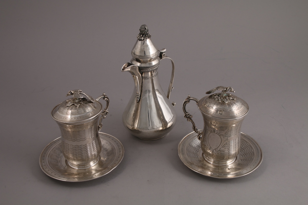 EMPIRE OTTOMAN. CAFETIÈRE et 2 TASSES COUVERTES en argent :