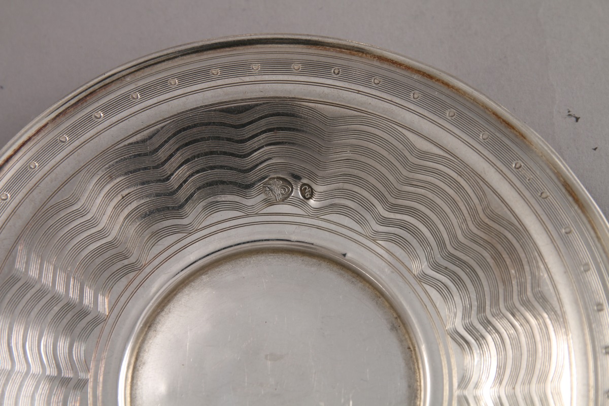 - Les deux TASSES COUVERTES et leur SOUS-TASSES en argent. De forme balustre et reposant sur un talon, les tasses sont ornées d'un décor gravé de médaillon, de vagues et filets. L'anse chantournée forme des rinceaux. Le couvercle bombé est surmonté d'un paon aux ailes déployées, sur une large feuille. Il est orné, tout comme la sous-tasse, d'un décor identique au corps de la tasse. Haut. 9,5 cm. Poids : 660 g.