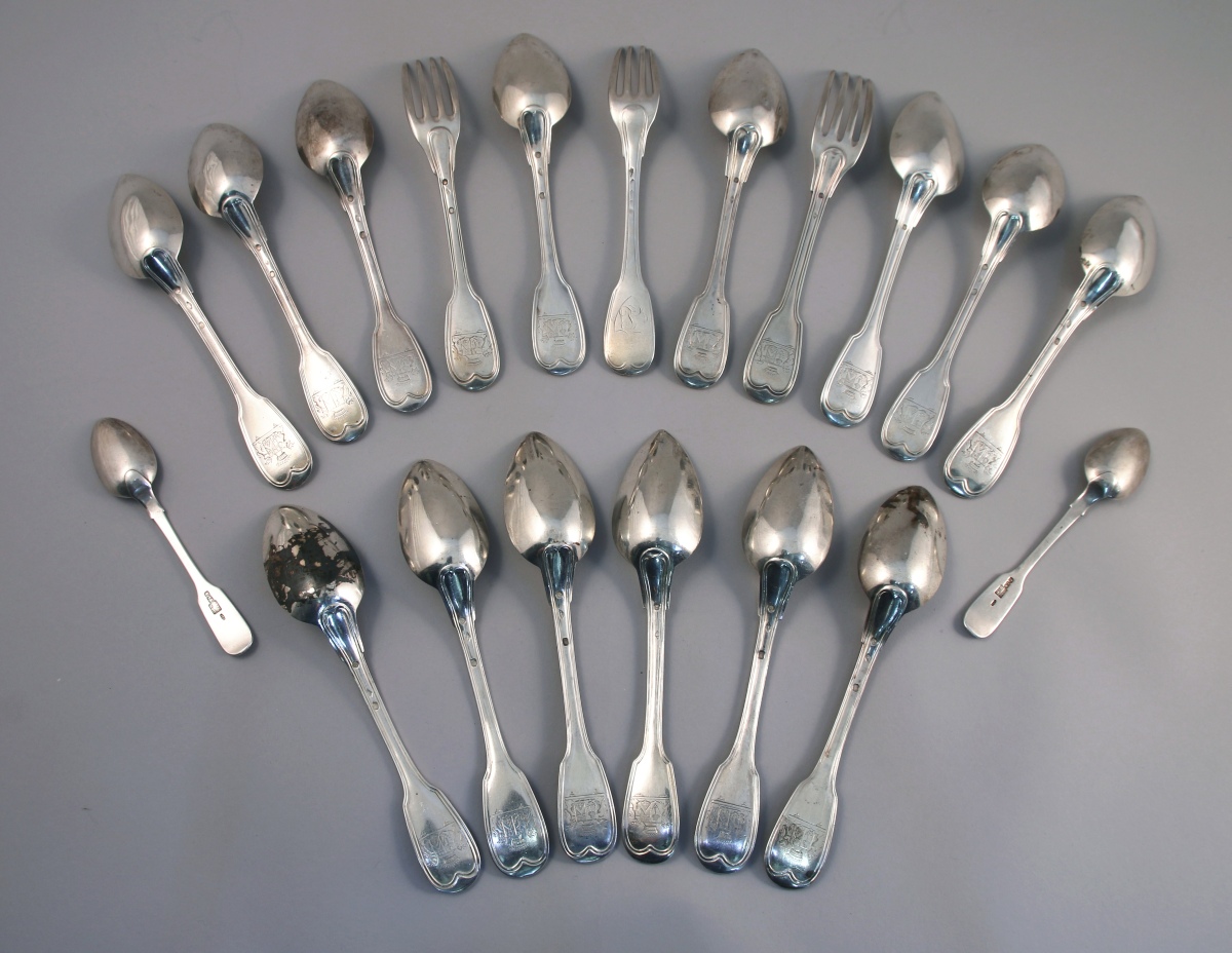 Suite de 2 COUVERTS et de 12 CUILLÈRES en argent, modèle filets-contours. Les spatules gravées aux armes d'alliance d'Armand Bayard de La Vingtrie et de Julie Enlart de Grandval (mariage en 1827), timbrées d'une couronne comtale et soupportées par des lions.