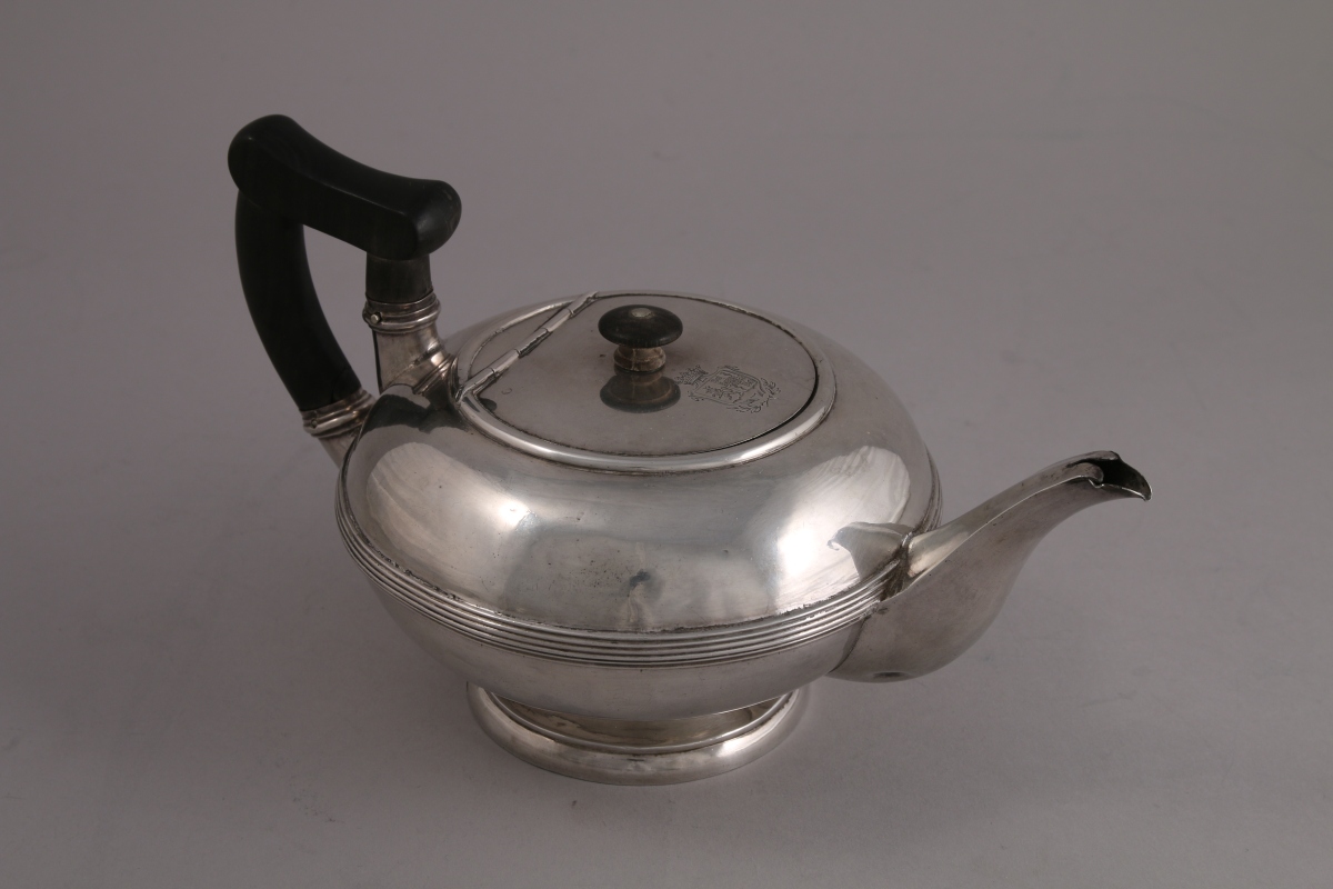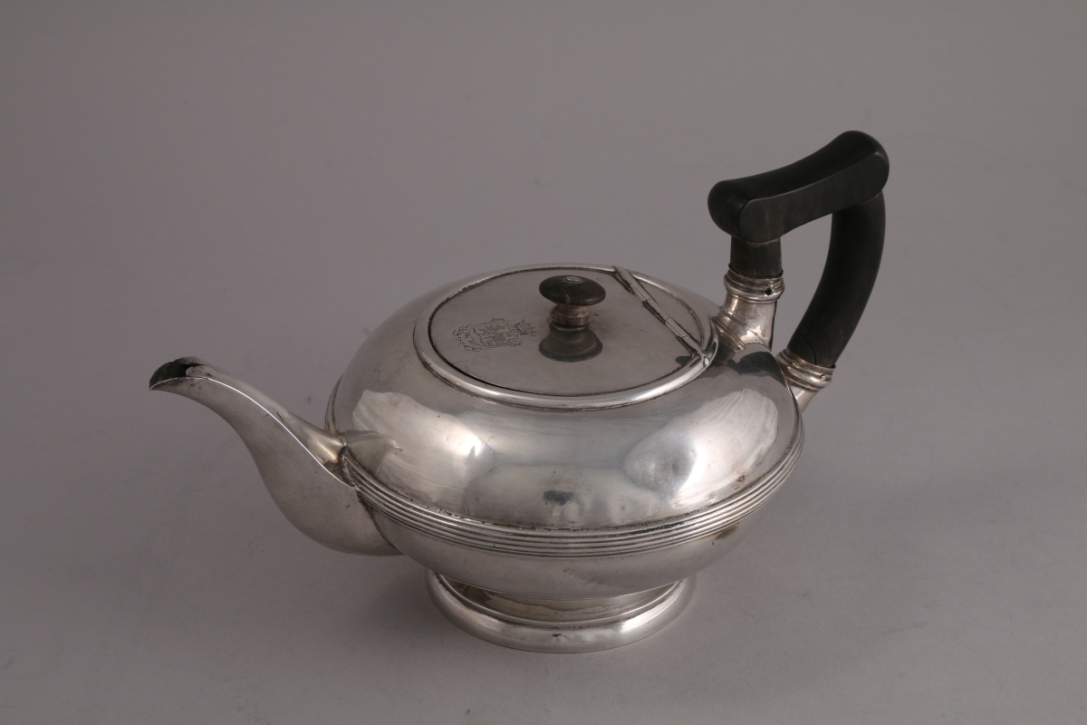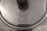 THÉIÈRE en boule applatie en argent reposant sur un piédouche. Le corps appliqué de filets. Le couvercle gravé d'armes d'alliance timbrées d'une couronne de marquis. Celles de senestre sont celles de la famille de La Motte Saint Pierre. Manche en bois noirci.