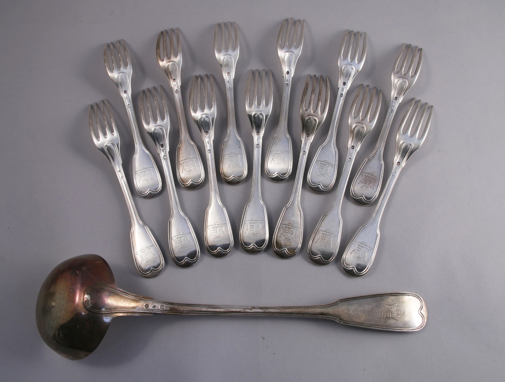 Suite de 12 FOURCHETTES et d'une LOUCHE, modèle filet-contour, en argent. Les spatules gravées d'armes d'alliance des familles La Verteville et de La Motte Saint-Pierre timbrées d'une couronne comtale.