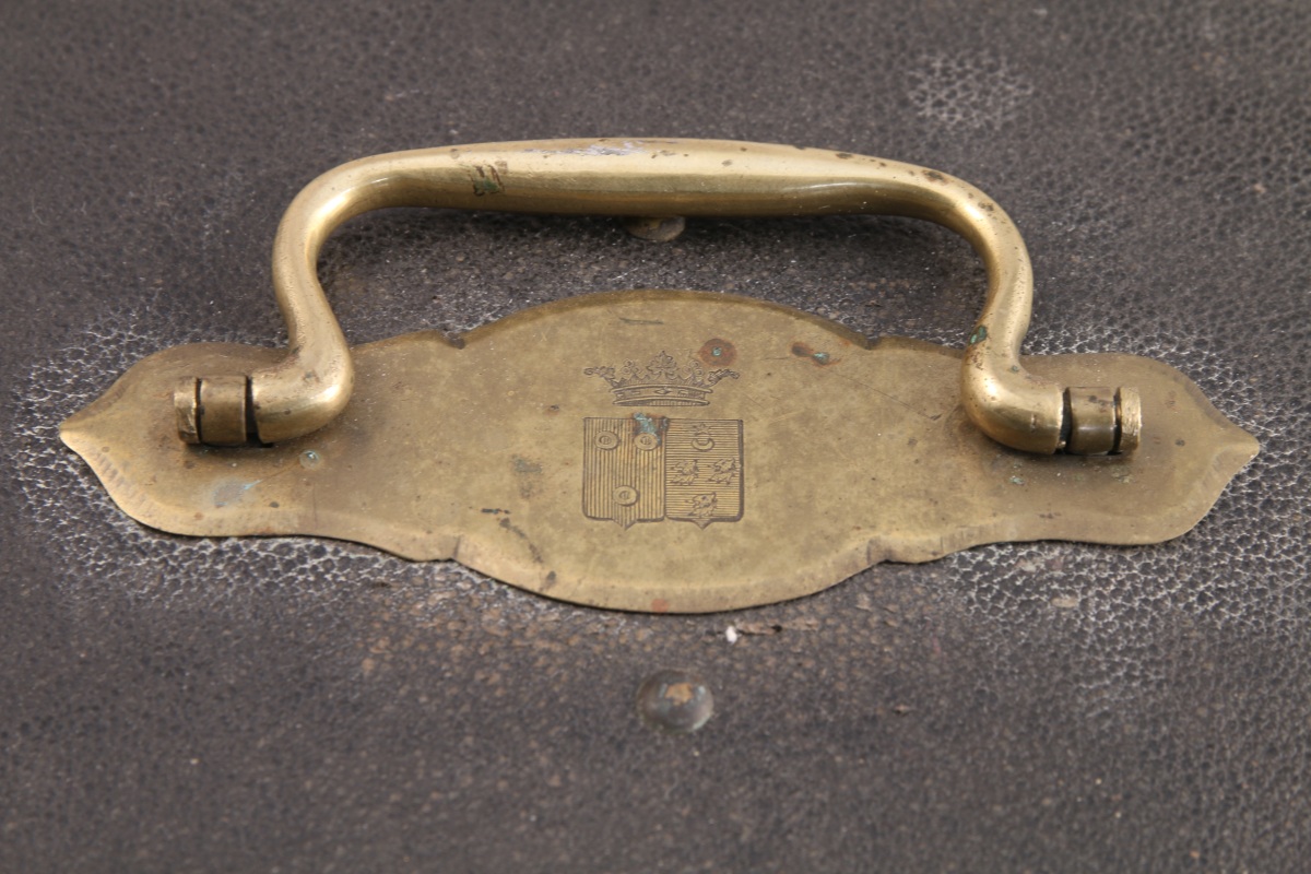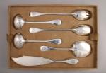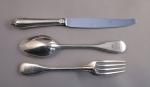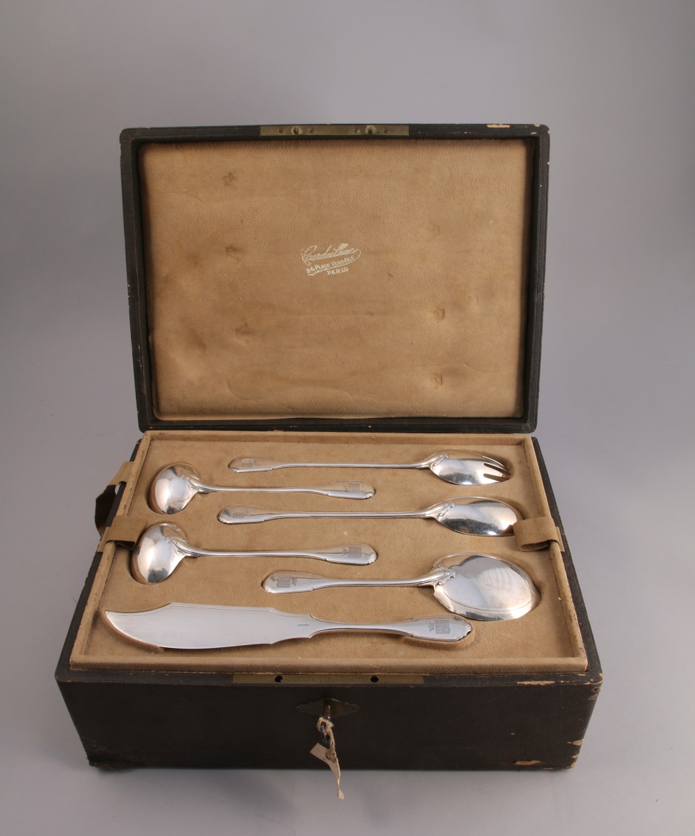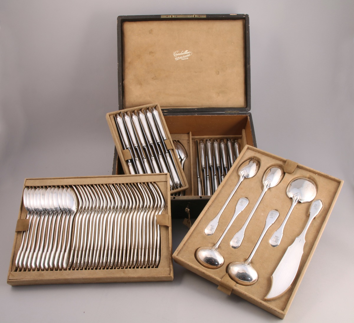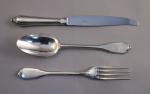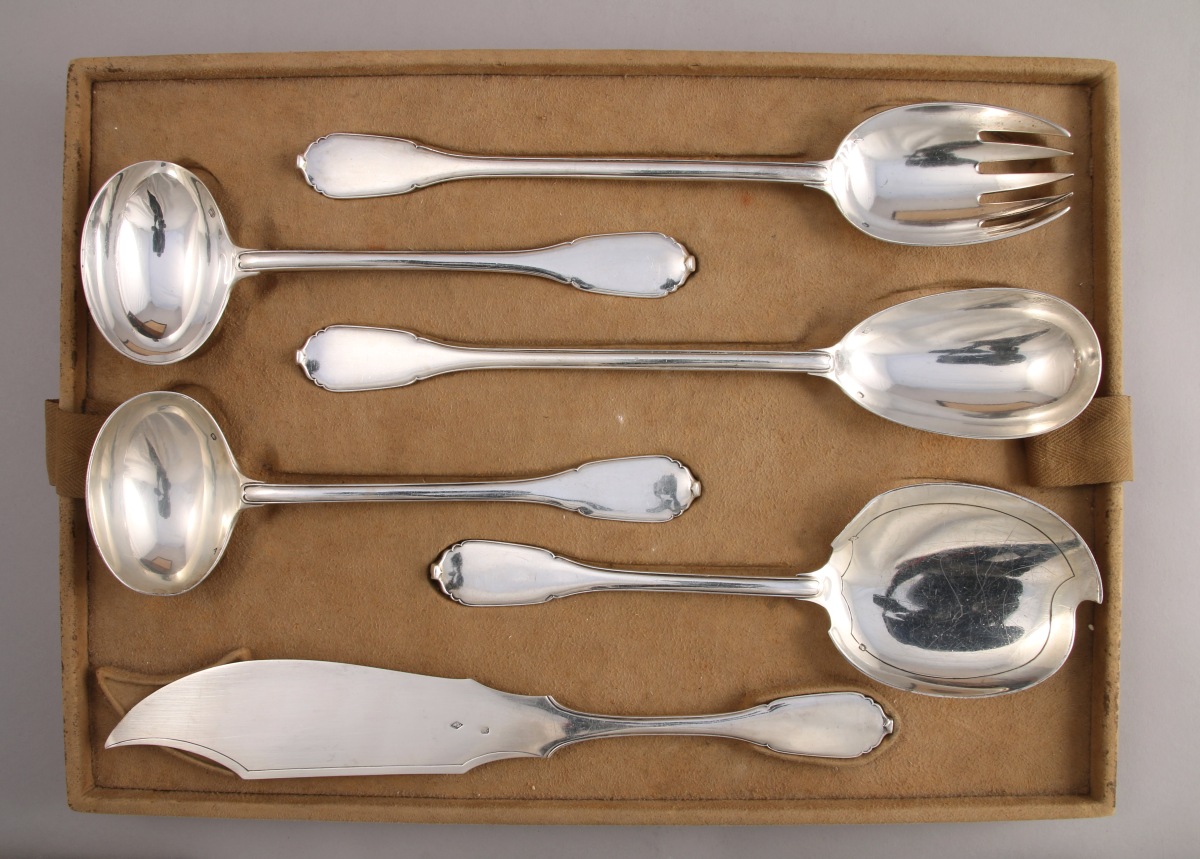CARDEILHAC. MÉNAGÈRE, 72 PIÈCES, en argent. Modèle filet-contour, attache en cuir découpé. Elle se compose de 18 couverts, de six fourchettes, de 24 couteaux, d'un couvert à salade, de deux cuillères à sauce, d'une pelle à glace et d'un couteau de service. Spatule gravée aux armes d'alliance des famille de Ferry à senestre et de Montjou à dextre, timbrées d'une couronne de marquis. Le manche des couteaux terminé par un degré sommé d'un bouton est orné d'arcs polylobé. Lame recourbée en acier. Dans son écrin aux armes (manque un plateau).