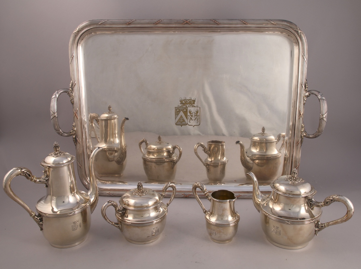 SERVICE à THÉ-CAFÉ en argent, QUATRE PIÈCES, composé d'une cafetière, d'une théière, d'un sucrier et d'un pot-à-lait. Décor de joncs rubanés, anses à attaches feuillagées, fretels en graine sur une terrasse d'acanthes. Corps gravés d'armes d'alliance timbrées d'un tortil de baron.