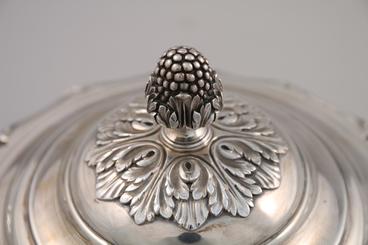 LÉGUMIER couvert en argent à batte-contours. La bordure ornée de joncs rubannés feuillagés. Les oreilles ajourées d'une large feuille d'acante. Couvercle à doucine sommé d'une prise en forme de graine reposant sur une terrasse feuillagée.