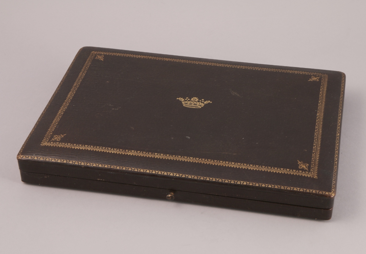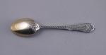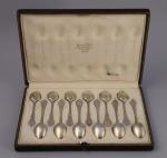 ODIOT. Suite de 12 CUILLÈRES À CAFÉ en argent. Manche et spatule finement ciselés d'un trophée au flambeau et carquois, guirlandes de lierre et de fleurs, rubans noués, rais de perles, culot feuillagé. Cuilleron en vermeil. Écrin de la maison Odiot en maroquin doré aux petits fers centré d'une couronne de marquis.