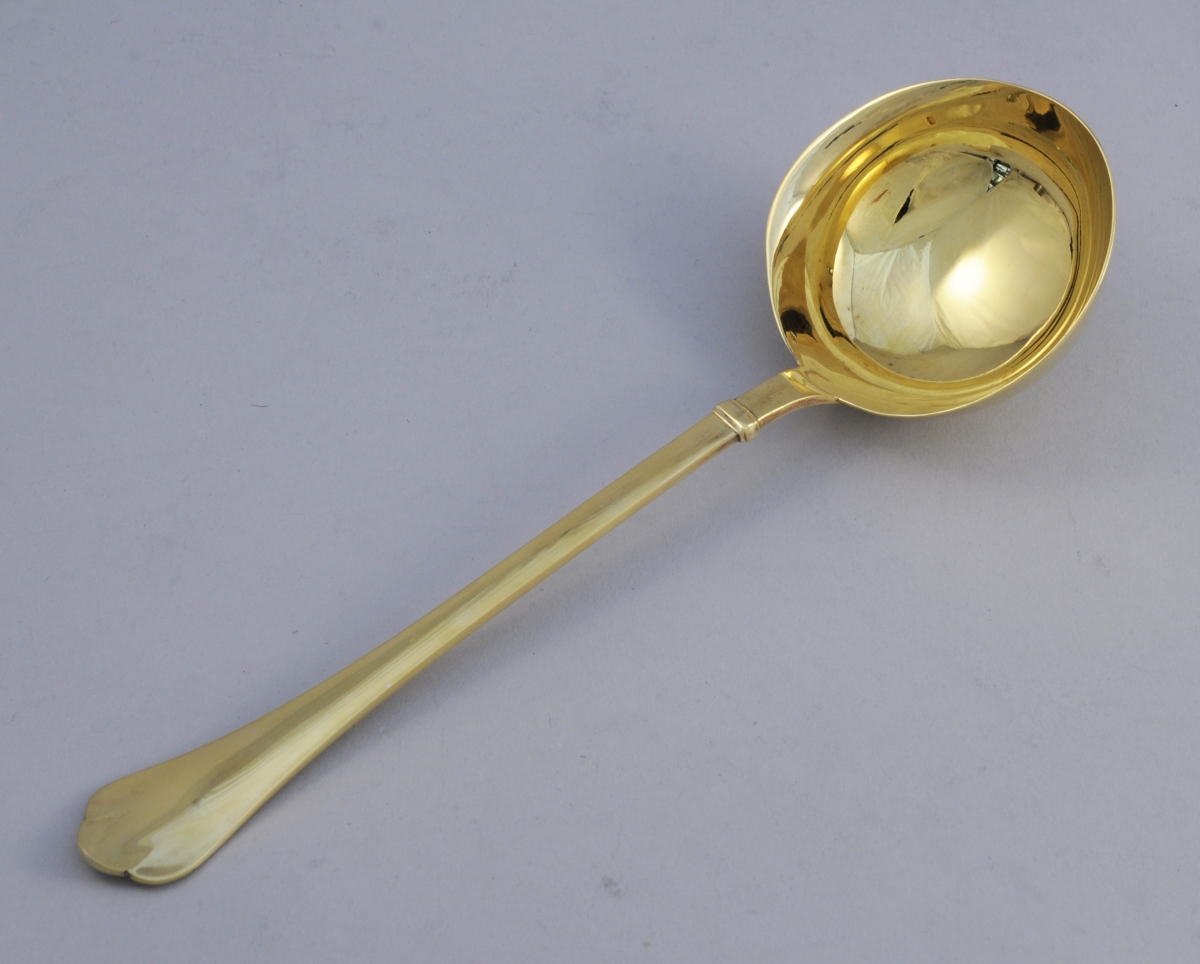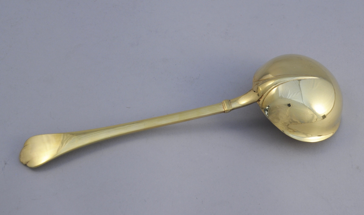 PUIFORCAT. LOUCHE À PUNCH en vermeil. Louchon à queue de rat, spatule trilobée. Dans sa boîte de la maison Puiforcat.
