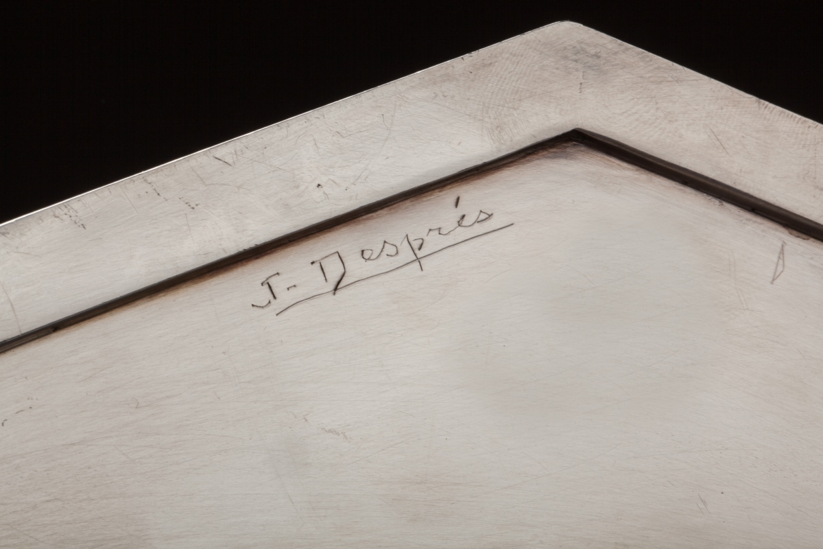 Jean DESPRÉS (1889-1980). PLATEAU de forme octogonale en métal argenté. L'aile et le contour du bassin sont martelés. Signé au stylet "J. Després".