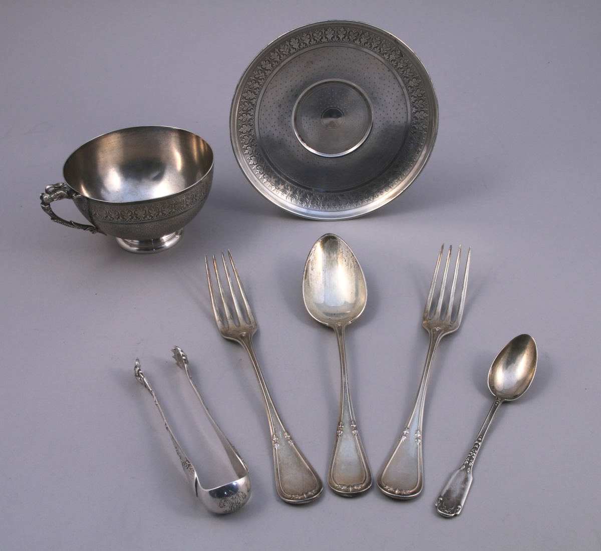 - 2 FOURCHETTES et une grande CUILLERE en argent à modèle filet contour et fleur de lotus.
