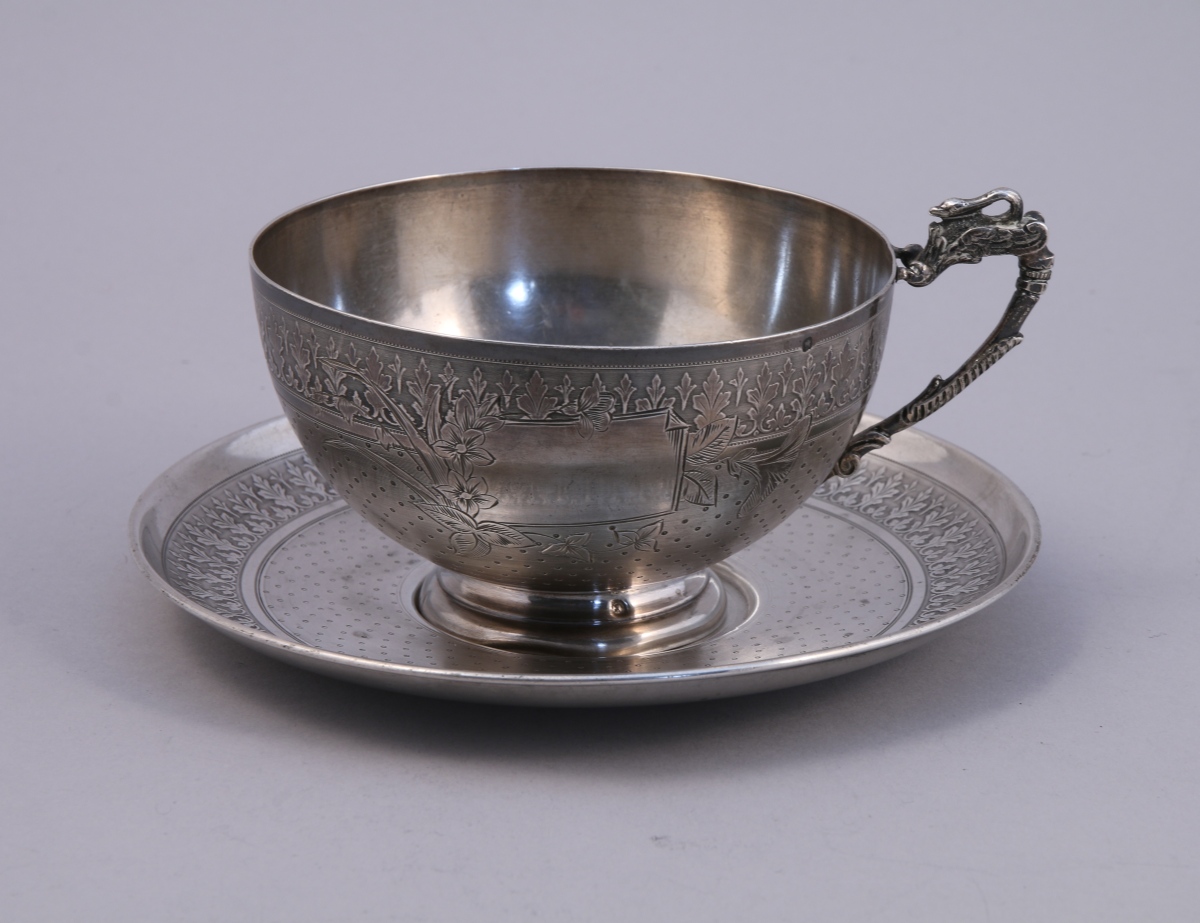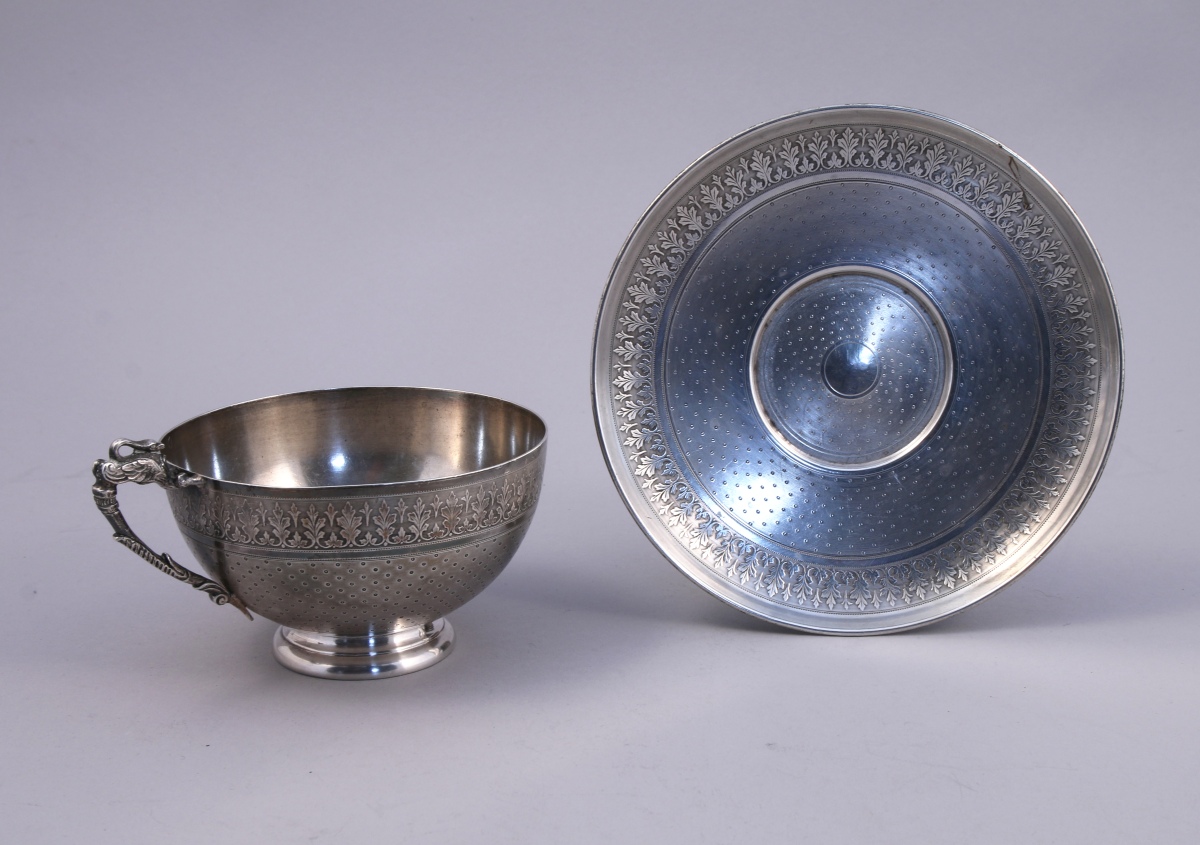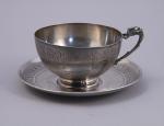- TASSE et sa SOUS-TASSE à décor guilloché avec une frise fleurie, l'anse figurant un griffon (Haut. 6,5 Diam. 16 cm).