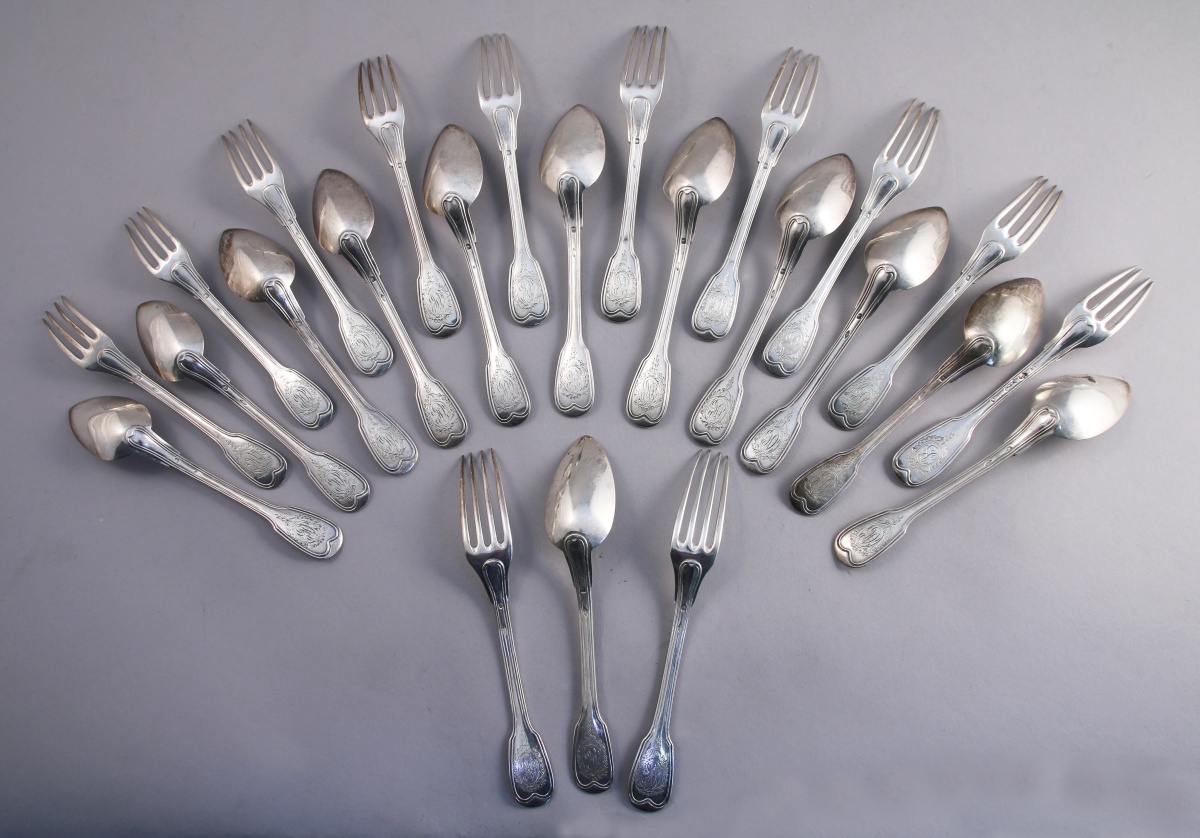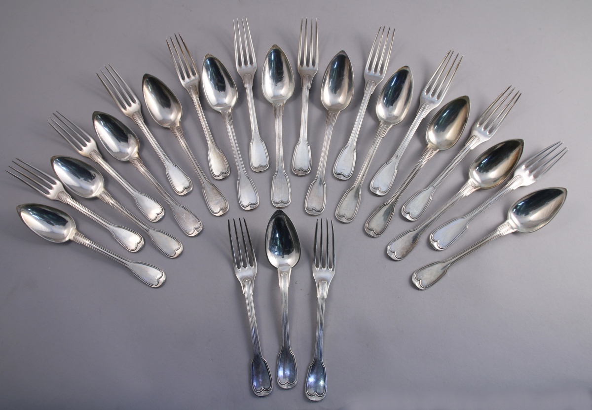 Suite de 12 COUVERTS à ENTREMETS en argent, modèle filet-contour. La spatule gravée d'un médaillon monogrammé "HC".