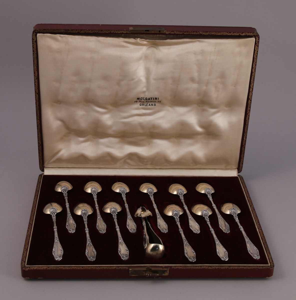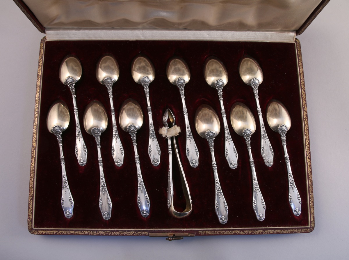 Suite de 12 CUILLÈRES à CAFÉ et PINCE à sucre en argent et vermeil à décor de palmettes, acanthes et enroulements feuillagés.