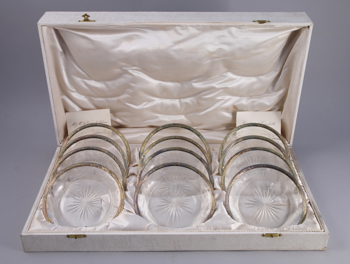 Suite de 12 DESSOUS de CARAFE en verre taillé d'une étoile et de motifs floraux. L'aile cerclée de vermeil à décor de joncs rubannés. Écrin monogrammé "BBL" sous une couronne comtale.