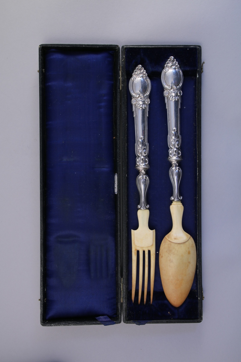 - COUVERT à SALADE, manche en argent fourré à décor repoussé de motifs végétaux stylisés, coquilles et agrafes feuillagées. Poinçon Minerve, style composite, XIXe. Long. 26,5 cm. Écrin.