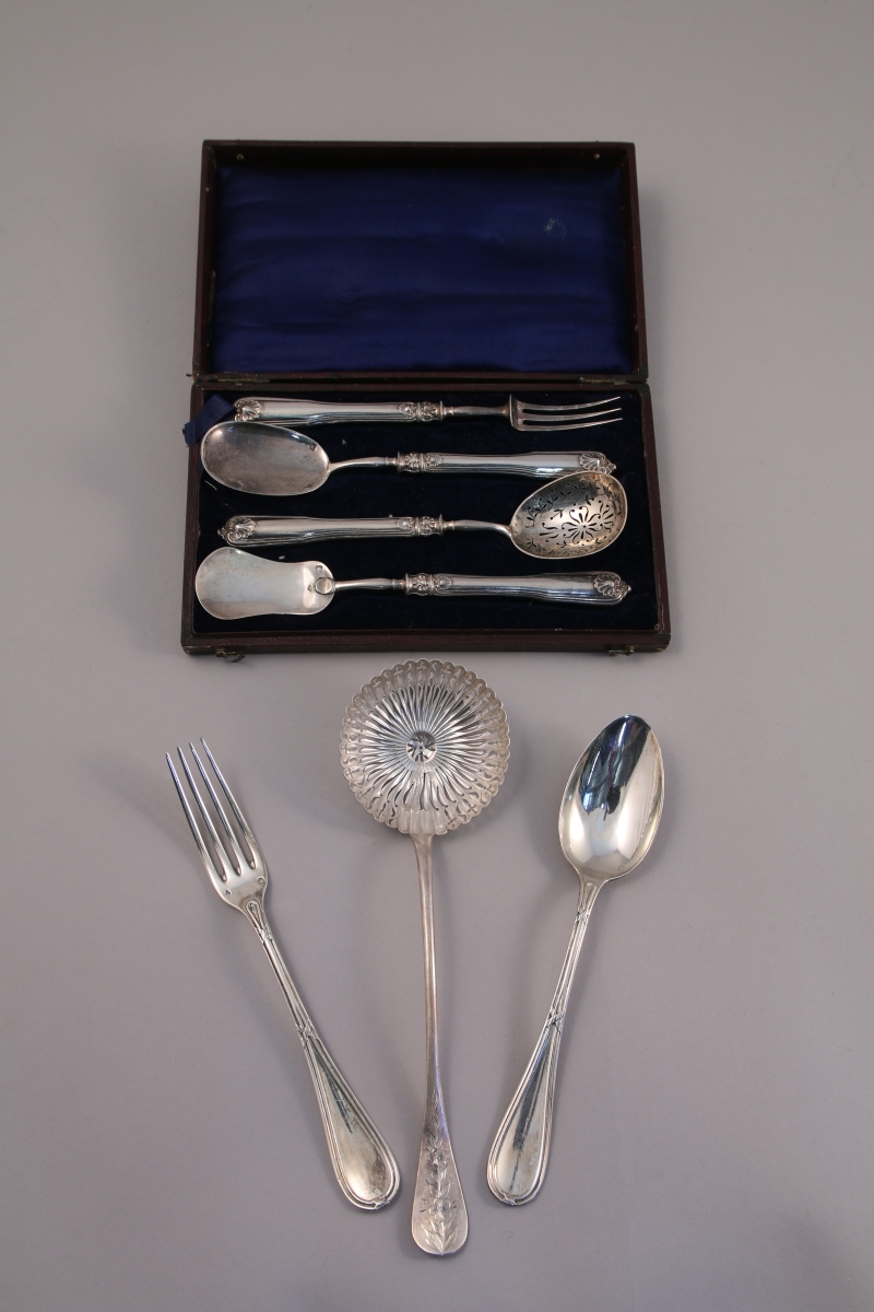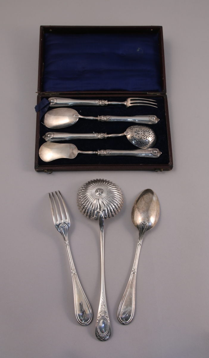 SERVICE à HORS-D'OEUVRES en argent, QUATRE PIÈCES, modèle filets-coquille. Il se compose de deux pelles, d'une cuillère à olives et d'une fourchette à piquer. Manche en argent fourré. Écrin.