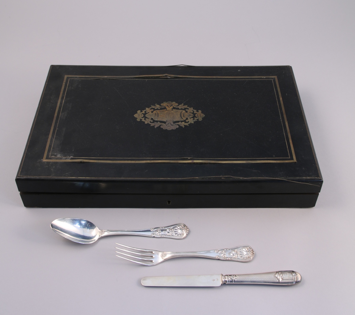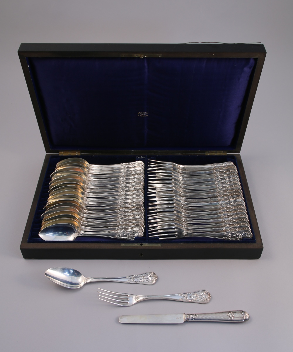 Suite de 24 COUVERTS À ENTREMETS en argent. Ils sont ornés d'une large coquille, d'acanthes et de filets. La spatule monogrammée "EC". Dans un coffret en bois noirci et filets de laiton au même monogramme.