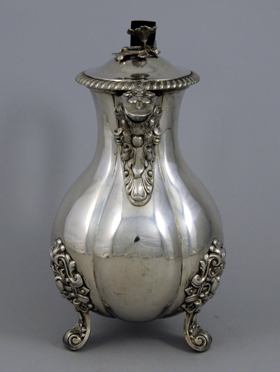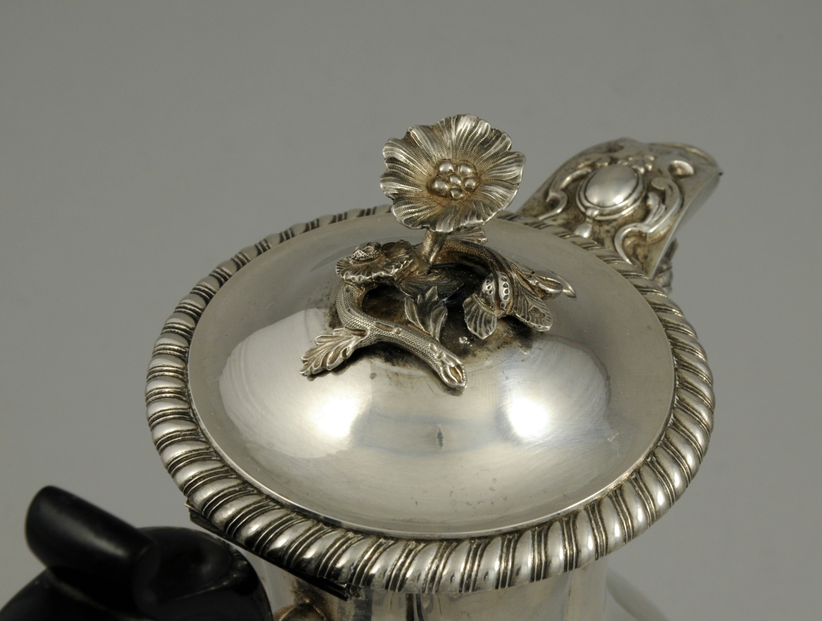CAFETIÈRE en argent de forme balustre à côtes. Couvercle à prise en forme de fleur, bec à écusson et feuilles d'acanthe. Repose sur trois pieds à coquilles et attaches de cuirs découpés. Anse en bois noirci.
