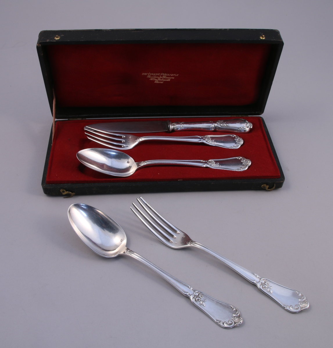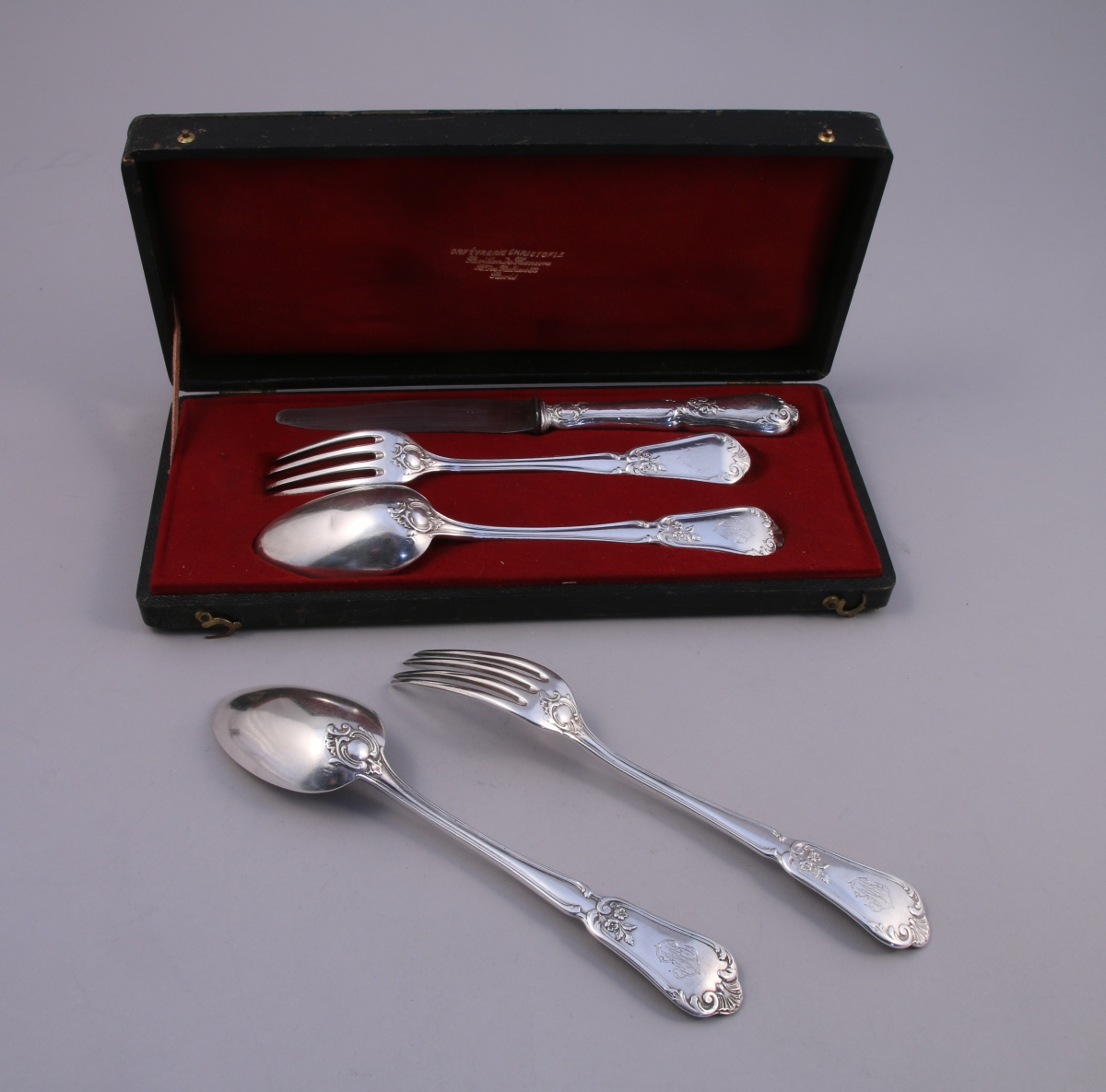 Suite de 2 COUVERTS et un COUTEAU en argent. Ils sont ornés d'acanthes, coquille, fleurettes et enroulements feuillagés. La spatule monogrammée "JM". Dans un écrin signé "Orfèvrerie Christofle / Pavillon de Hanovre / Bd des Italiens, 33 / Paris".