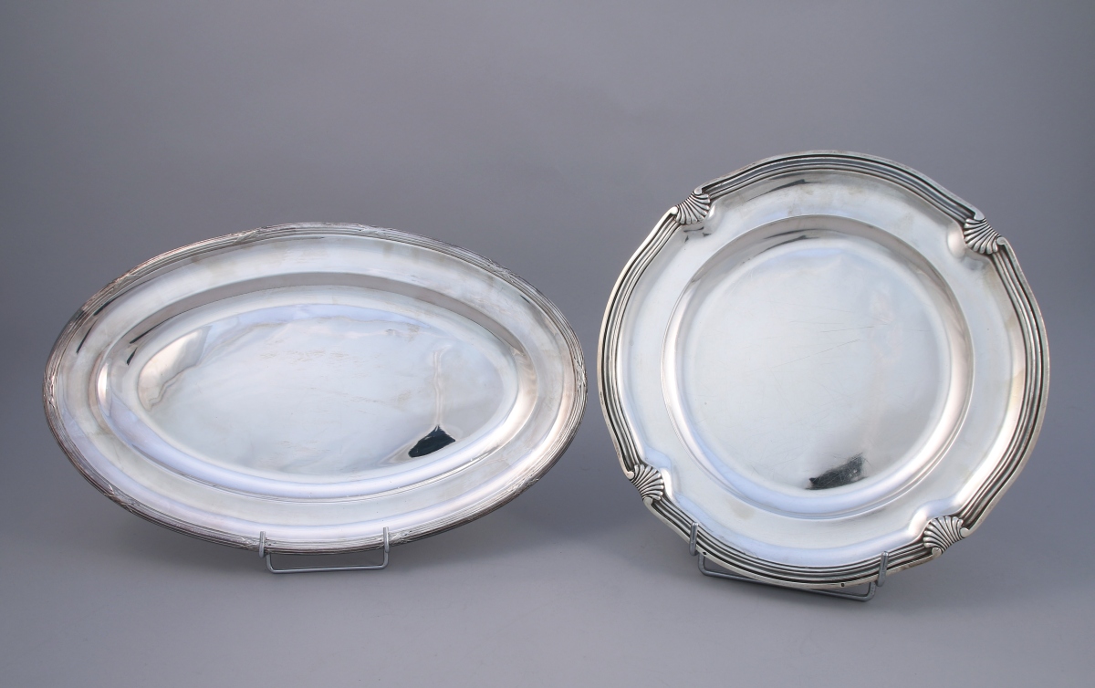 PLAT de forme ronde en argent. Modèle filets-contours agrémentés de quatre coquilles. Poinçon Minerve, style Régence, fin XIXe, début XXe.