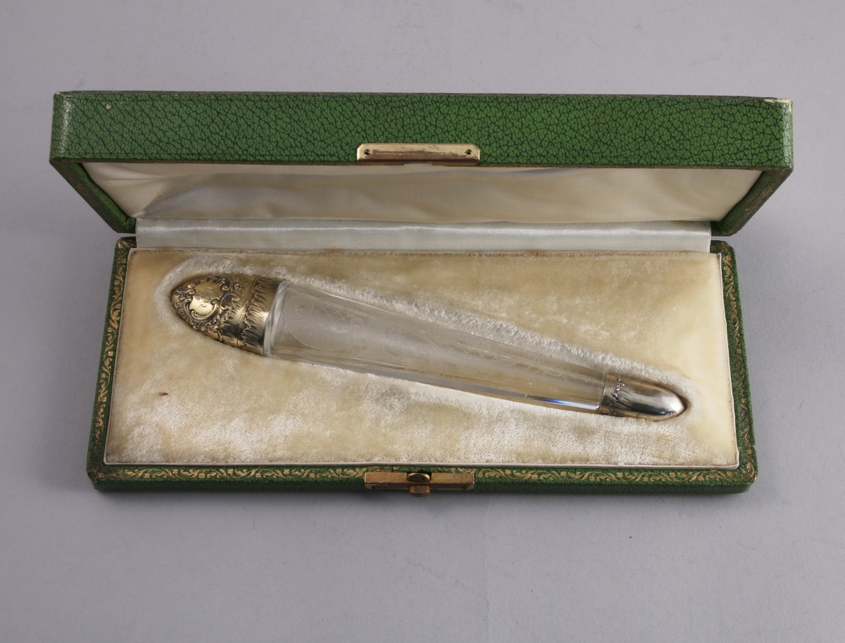 FLACON de forme oblongue en cristal taillé de croisillons, rinceaux, enroulements et aile de chauve-souris. Garnitures en vermeil, le bouchon centré d'un cartouche rocaille monogrammé "JM". Écrin.